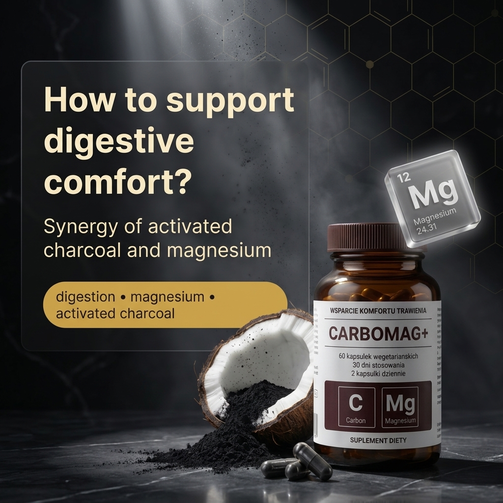 CarboMag+ blends coconut-shell activated charcoal with magnesium carbonate in vegetarian capsules. Natural support for post-meal comfort. 60 caps, 30 days.