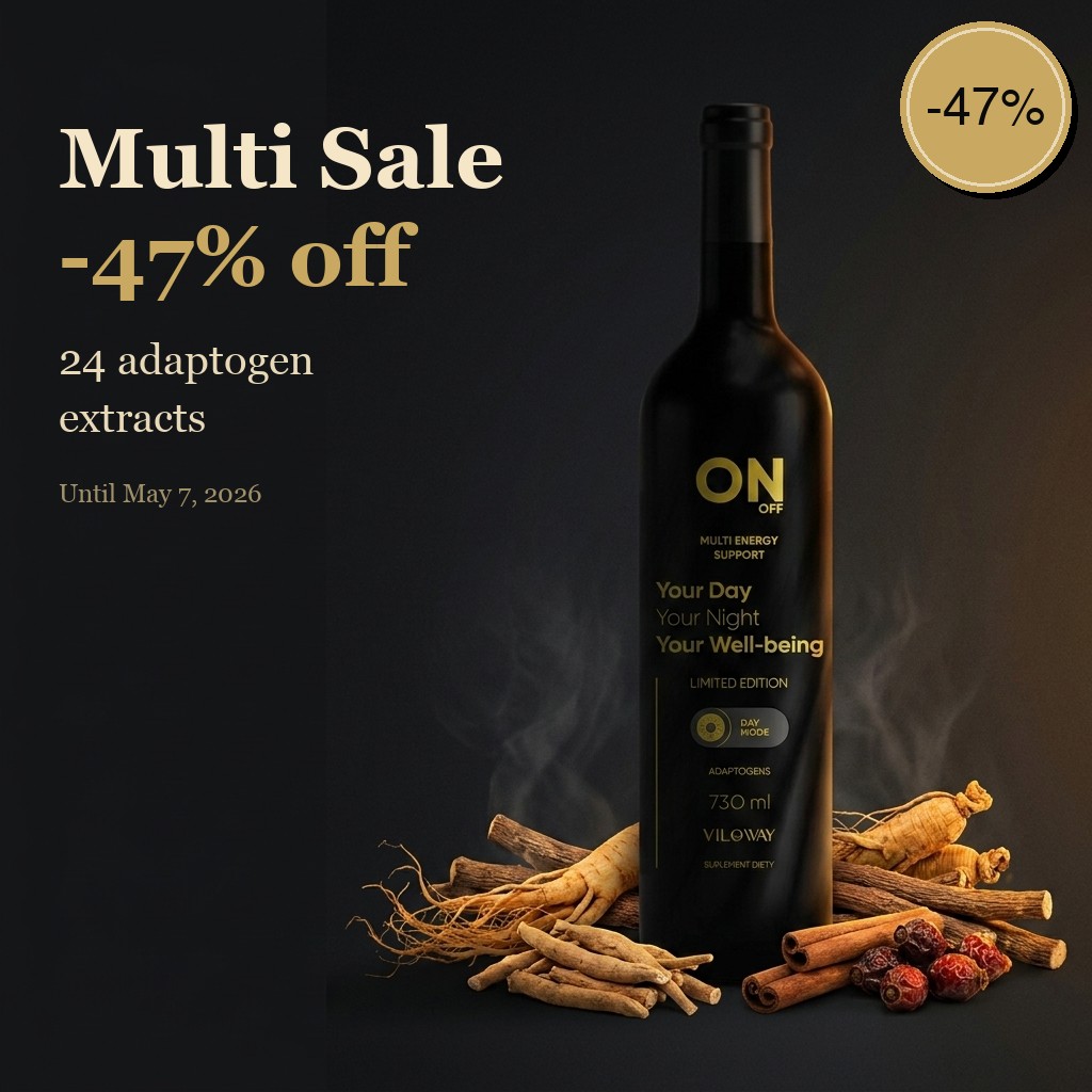 Multi ON and Multi OFF - herbal elixir with 24 adaptogens, up to -47% off. 1, 2 and 4-bottle options, full adaptogen course. Until May 7, 2026.