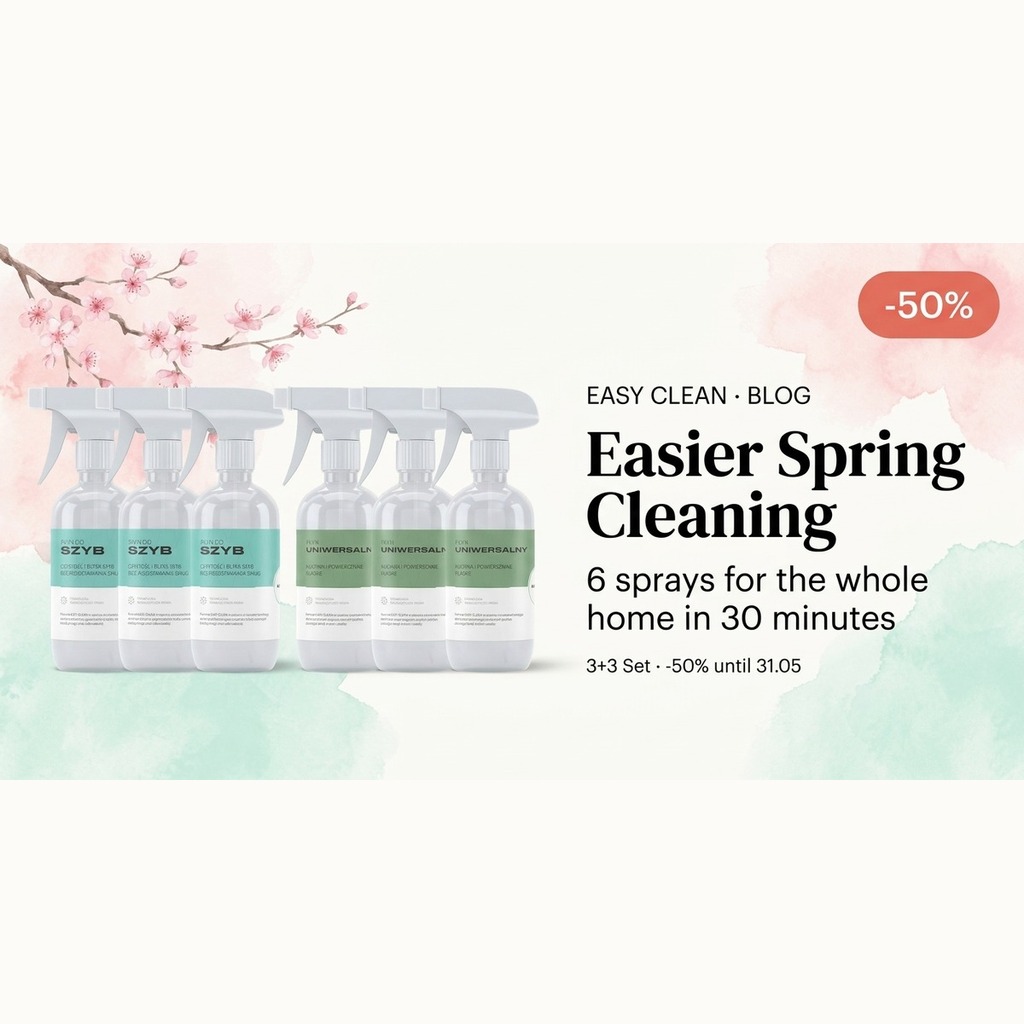 After winter the windows are grey, kitchen counters sticky, mirrors streaked. The Easy Clean 3+3 set = a simple plan for the whole home with two sprays instead of five different chemicals.