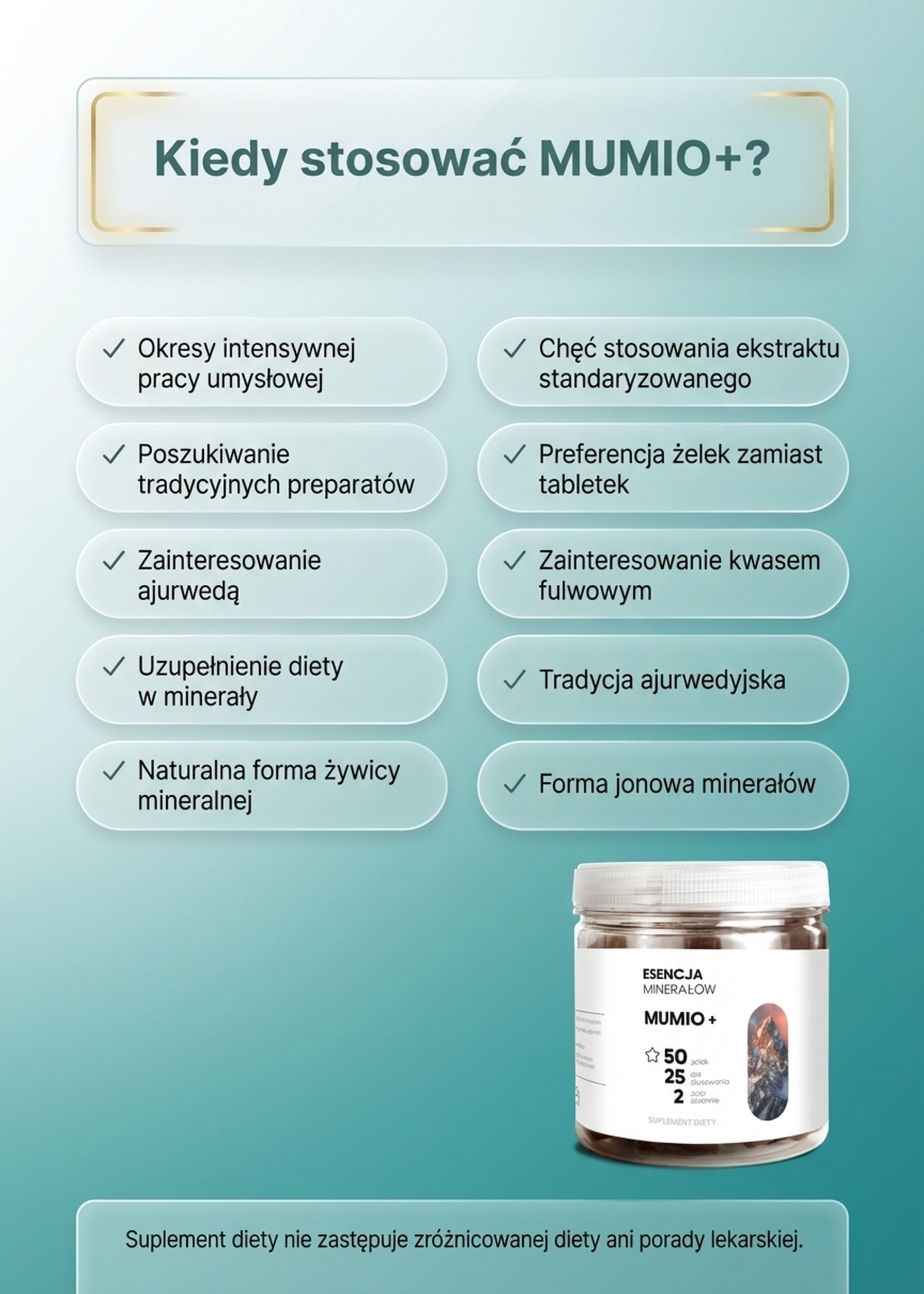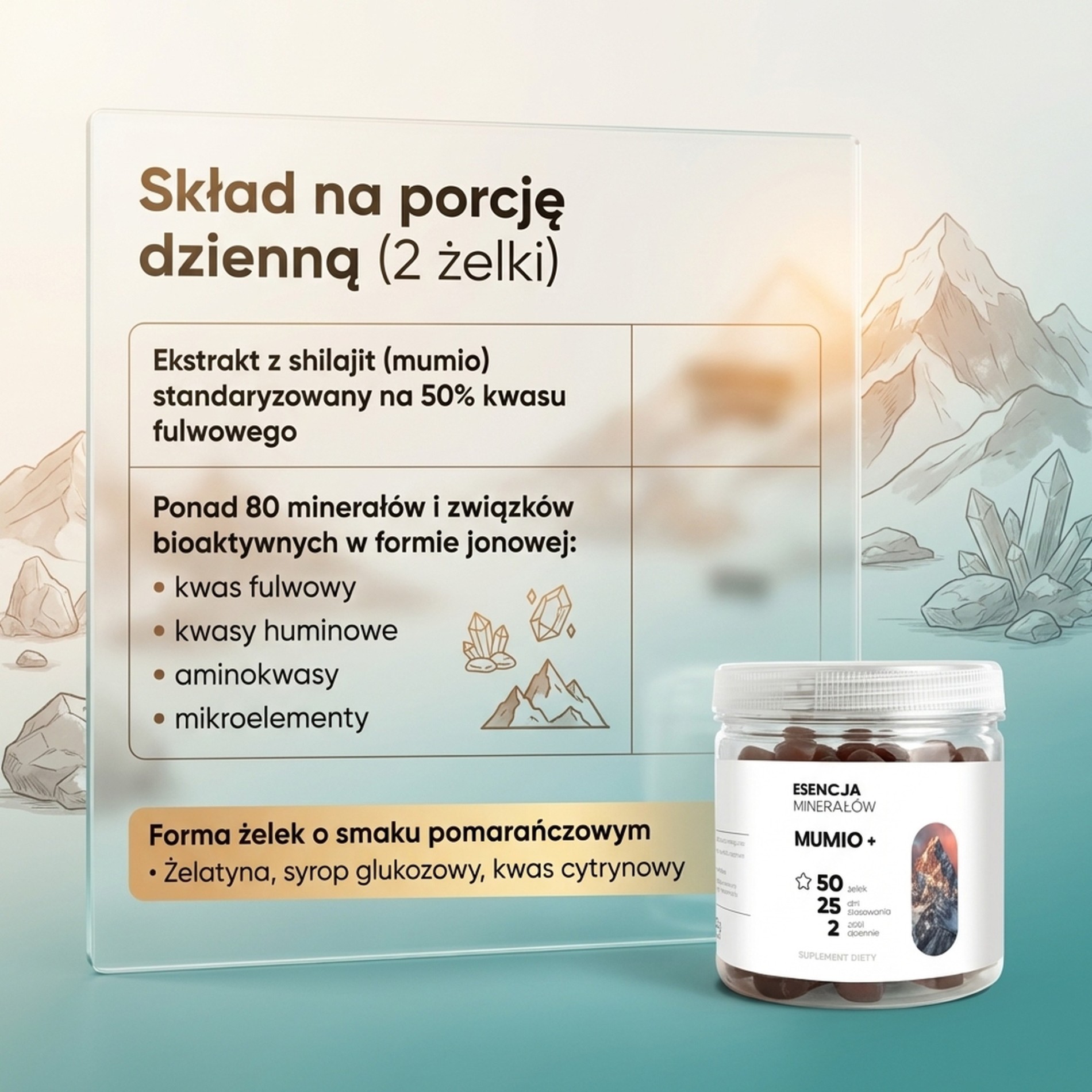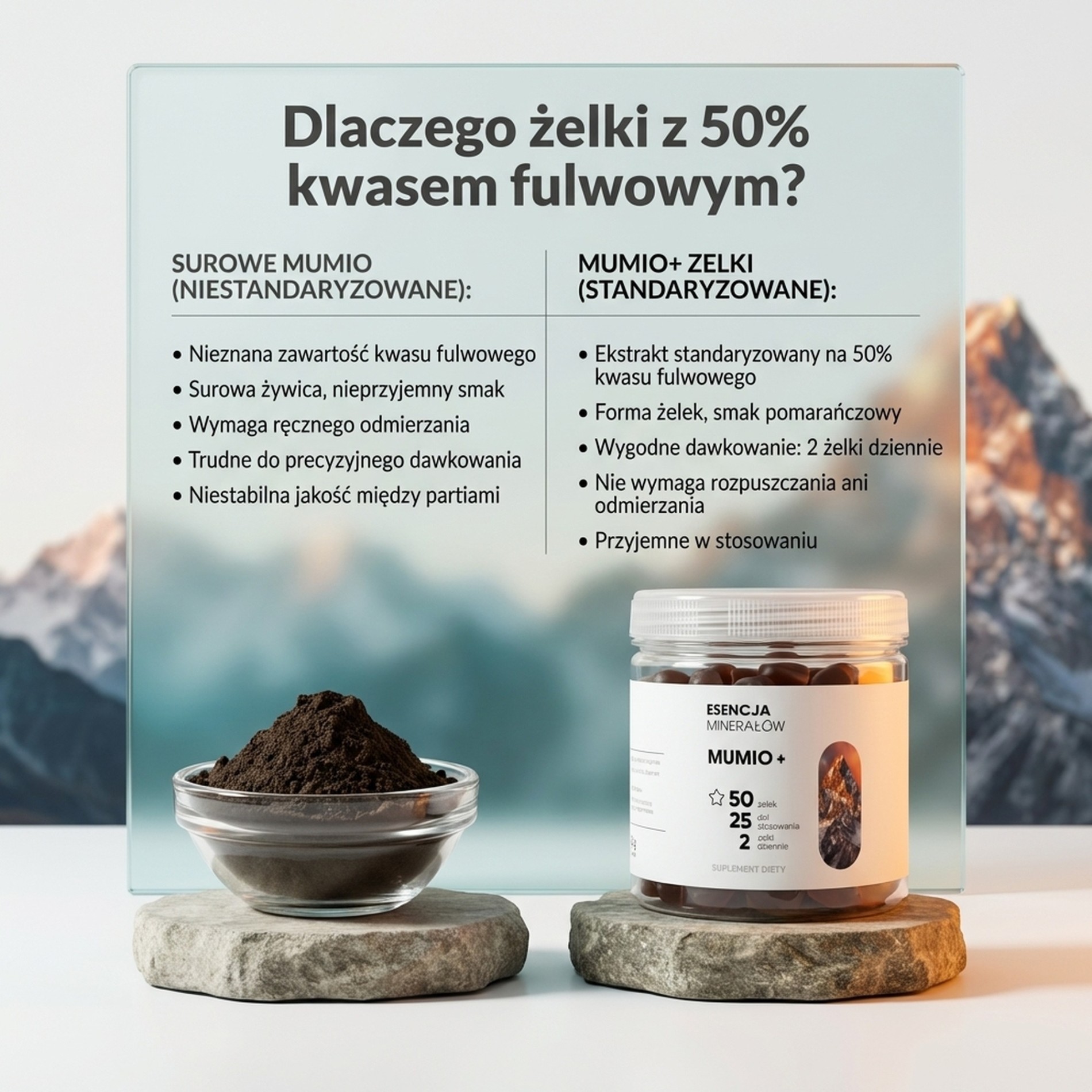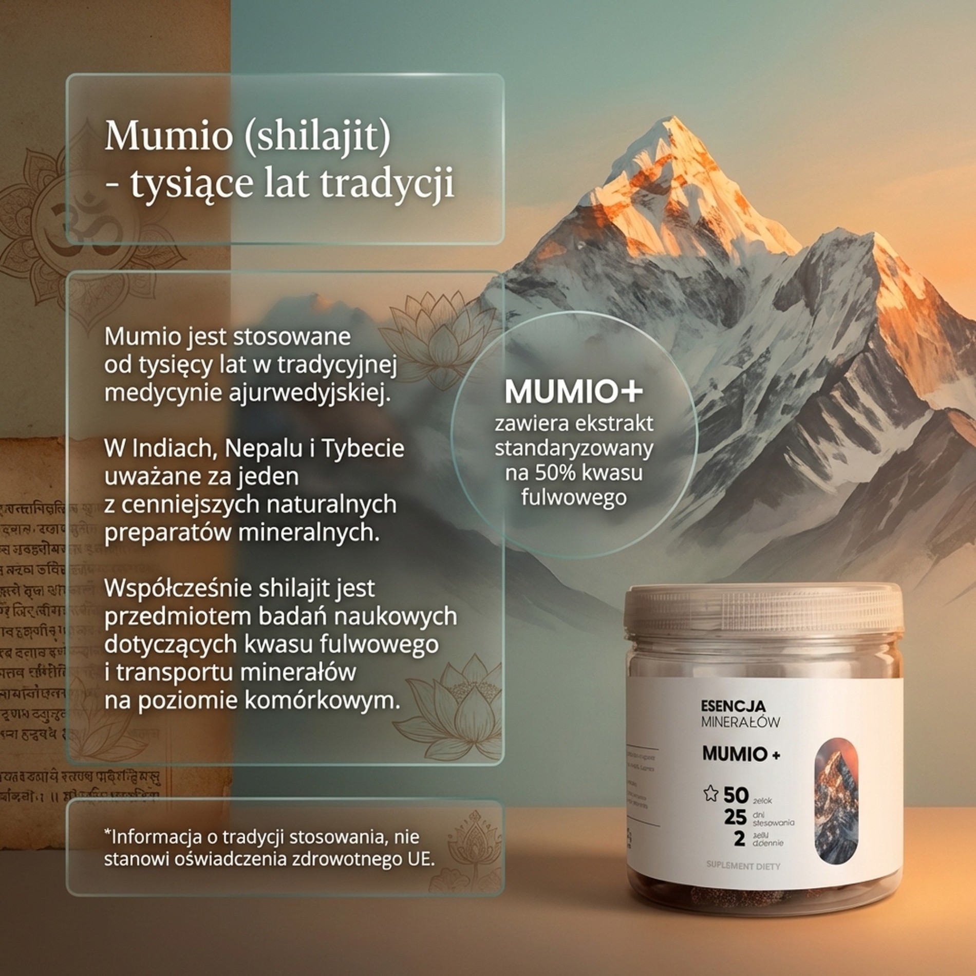 From the perspective of modern medicine, mumio is a complex blend of humic and fulvic acids, rich in over 80 minerals in ionic form as well as numerous bioactive compounds. Fulvic acid, to which this supplement is standardized, plays a key role as a natural chelator - it facilitates the transport of nutrients into cells and supports the elimination of toxins from the body.