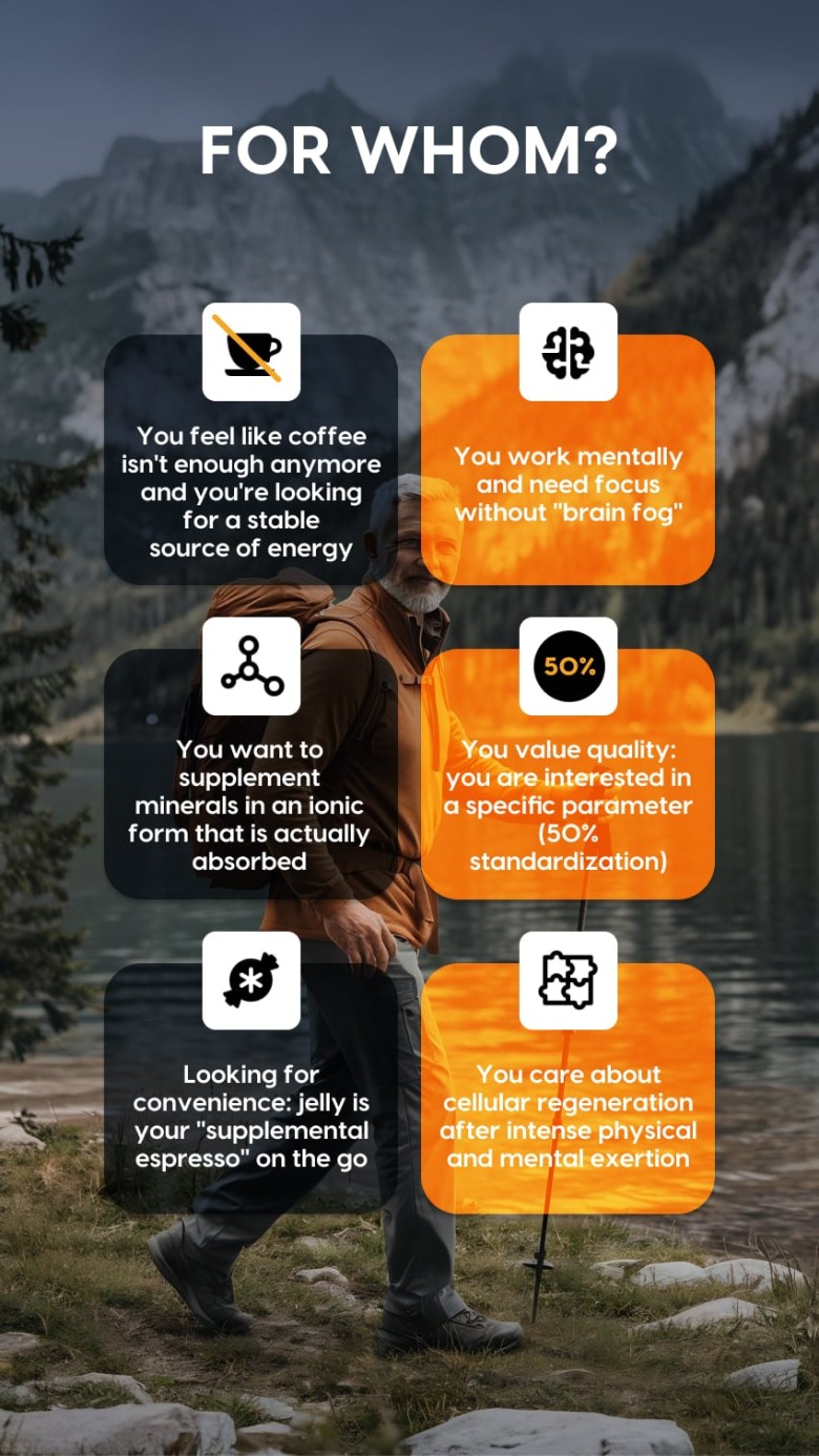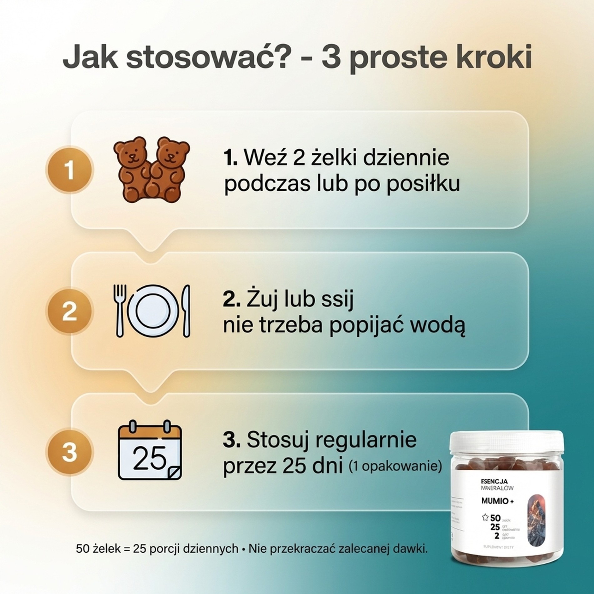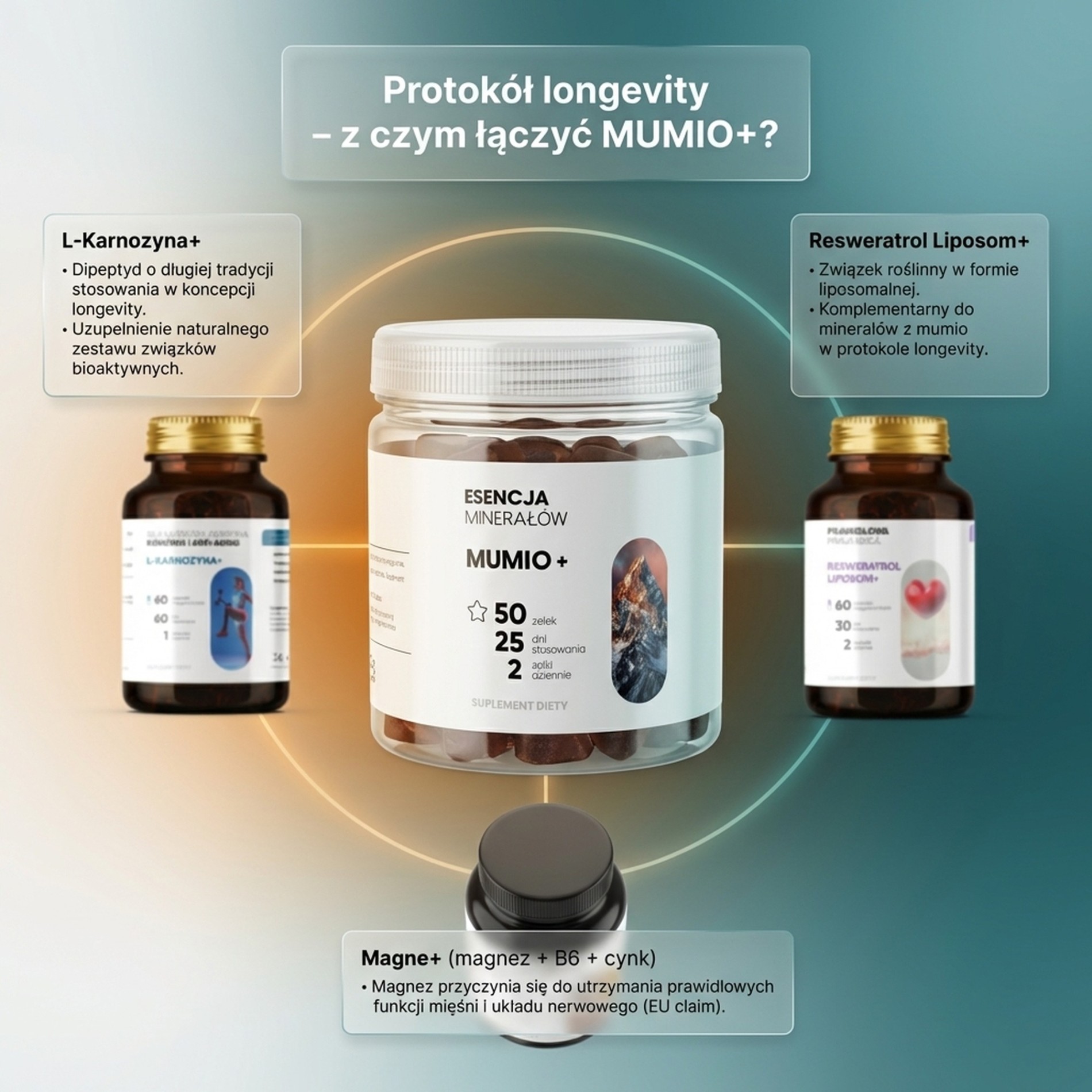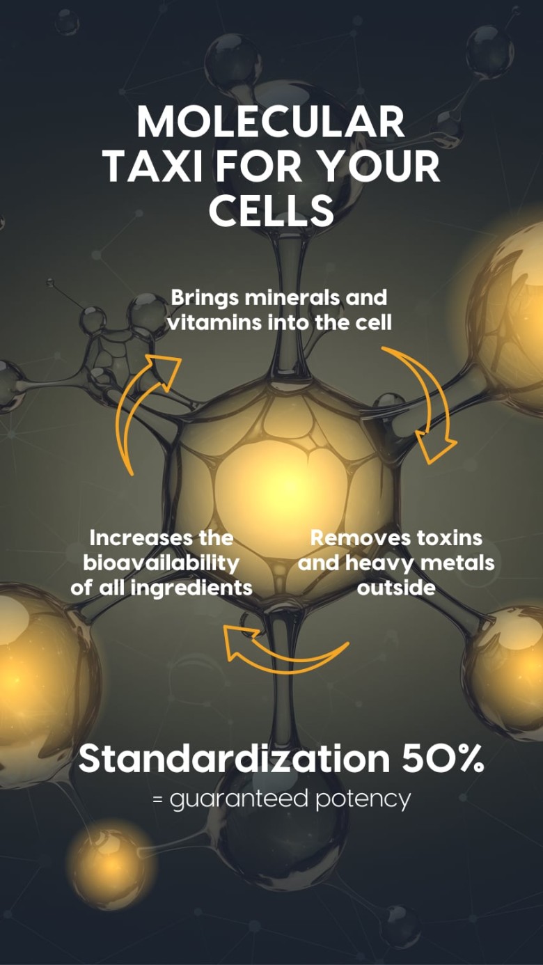 From the perspective of modern medicine, mumio is a complex blend of humic and fulvic acids, rich in over 80 minerals in ionic form as well as numerous bioactive compounds. Fulvic acid, to which this supplement is standardized, plays a key role as a natural chelator - it facilitates the transport of nutrients into cells and supports the elimination of toxins from the body.