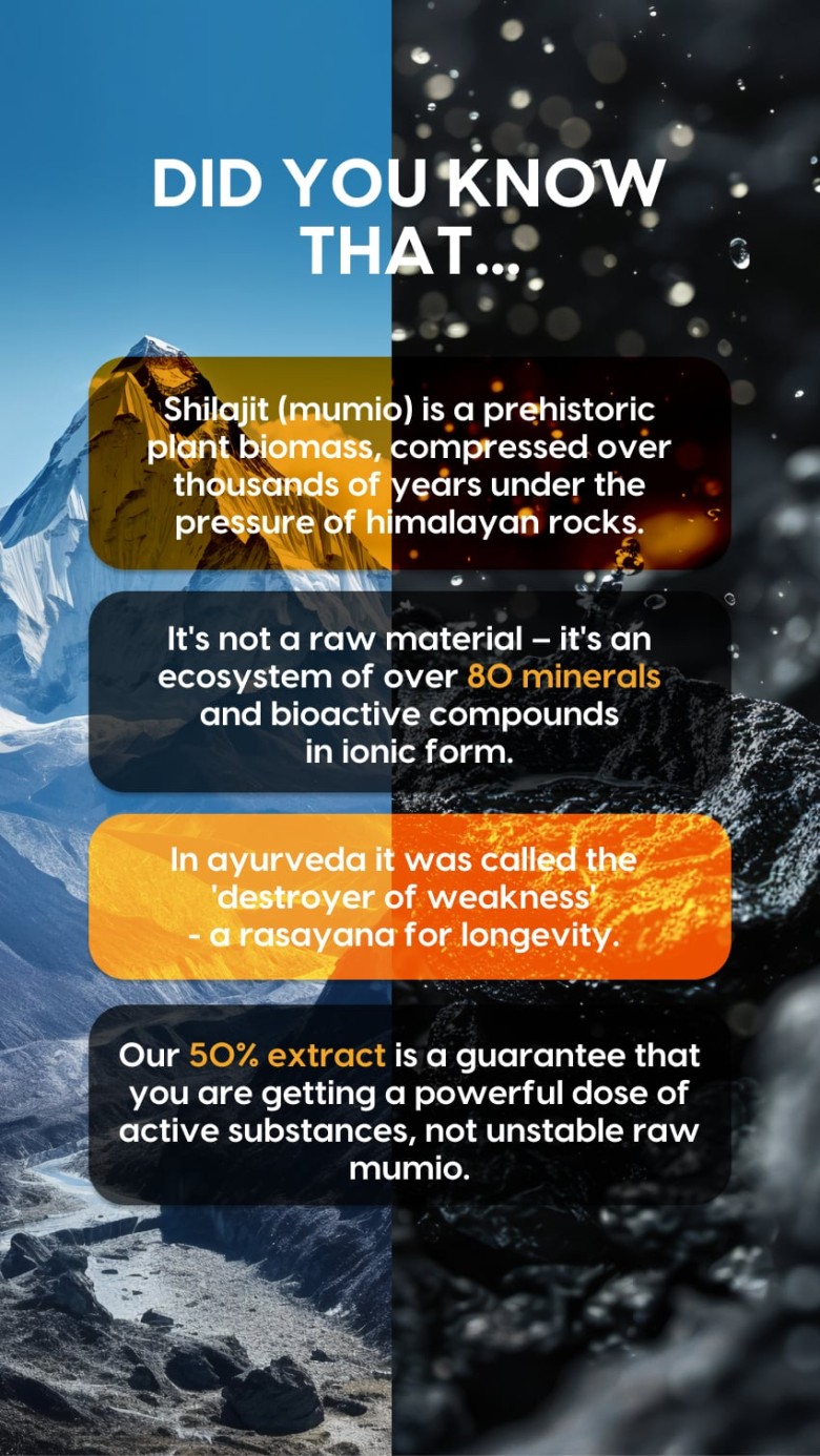 Mumio+ is a bridge between the ancient wisdom of the Himalayas and modern scientific knowledge - a natural way to support vitality, energy, and longevity.