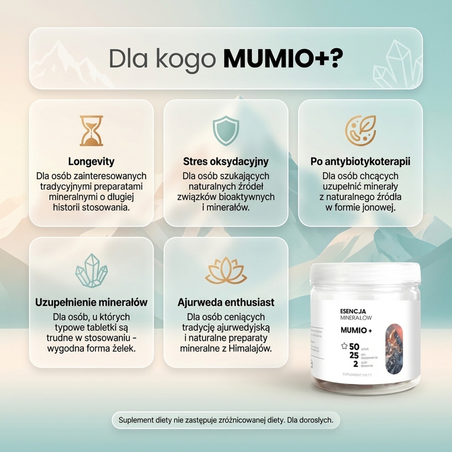 It should be remembered that mumio is not a medicine and does not replace pharmacological treatment. It is a dietary supplement that supports the body’s natural functions. Individuals with chronic illnesses, those taking medications or those under constant medical care should consult a physician before use.