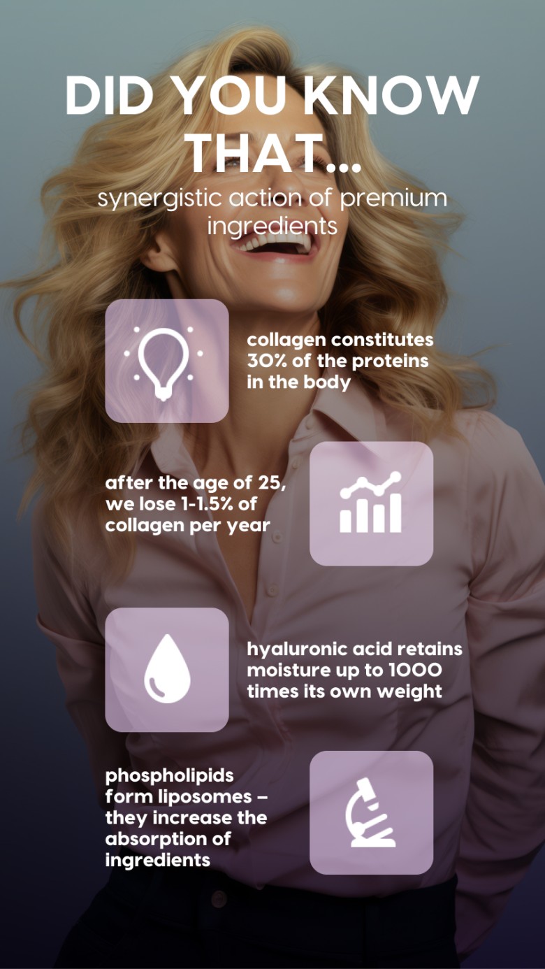 Liposomal Collagen+ with blueberry flavor is an advanced formula created for people who want to take comprehensive care of youthful-looking skin, healthy hair and strong nails - in a pleasant, great-tasting form. The product combines carefully selected active ingredients - from phospholipids derived from sunflower seeds to as much as 1,385 mg of marine collagen per serving - supporting tissue regeneration at the cellular level.
