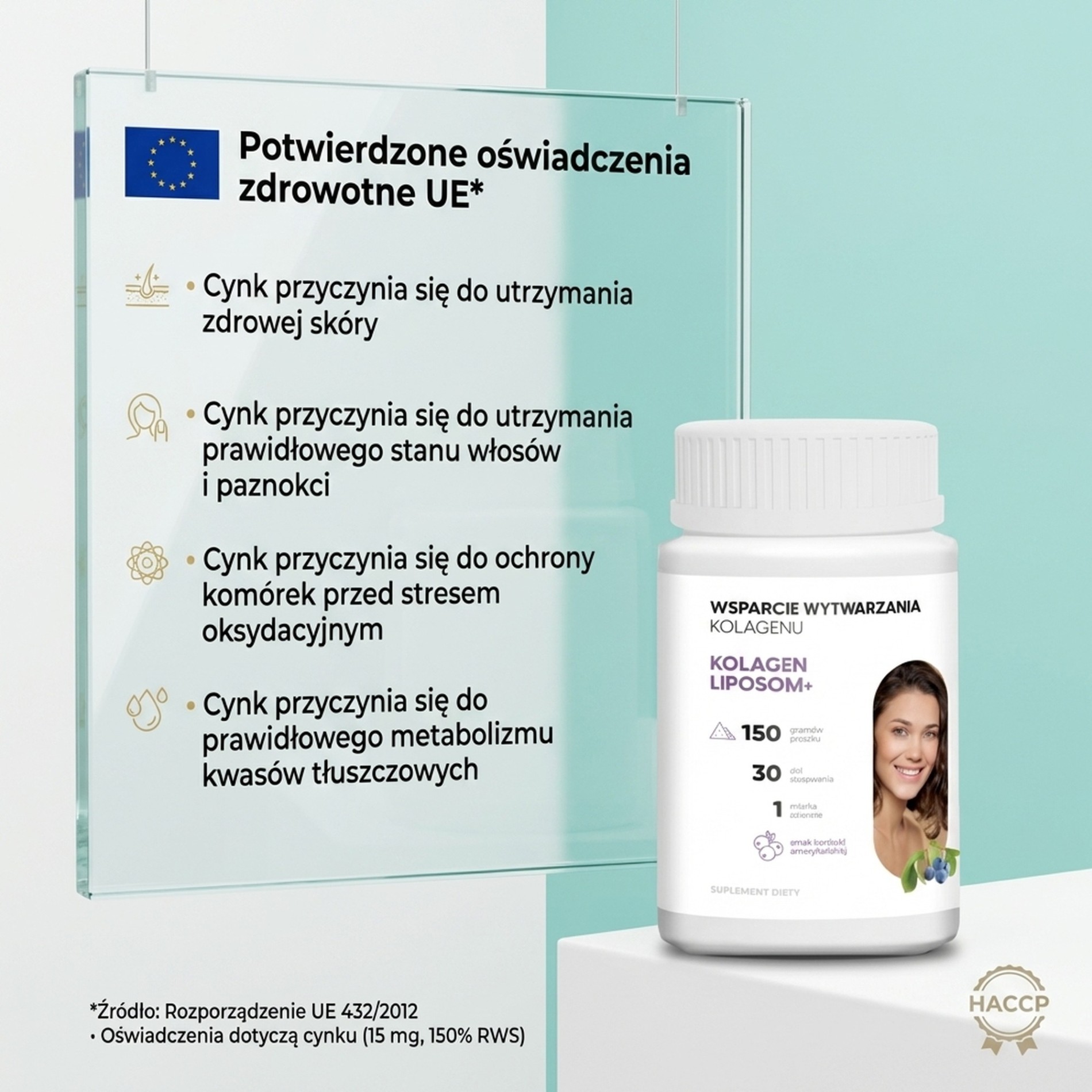 Hyaluronic acid, together with enhanced doses of bitter orange bioflavonoids (170 mg) and grape seed OPC (190 mg), forms a powerful antioxidant blend that protects cells from oxidative stress, supporting natural regenerative processes. Zinc at an optimal dose of 15 mg (150% NRV) additionally supports protein and DNA synthesis, which is crucial for proper connective tissue function, including skin, hair and nails.