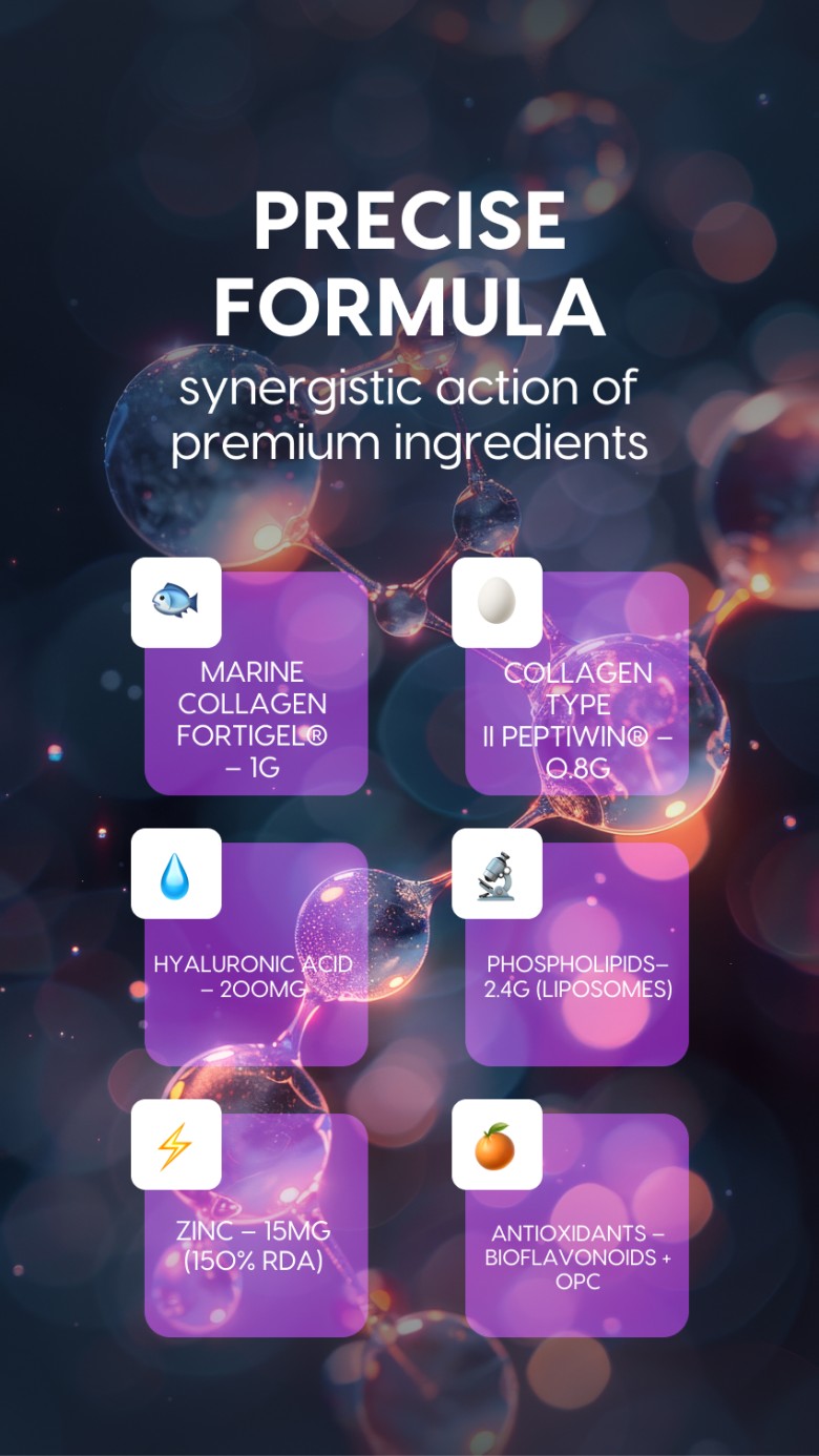 Hyaluronic acid, together with enhanced doses of bitter orange bioflavonoids (170 mg) and grape seed OPC (190 mg), forms a powerful antioxidant blend that protects cells from oxidative stress, supporting natural regenerative processes. Zinc at an optimal dose of 15 mg (150% NRV) additionally supports protein and DNA synthesis, which is crucial for proper connective tissue function, including skin, hair and nails.