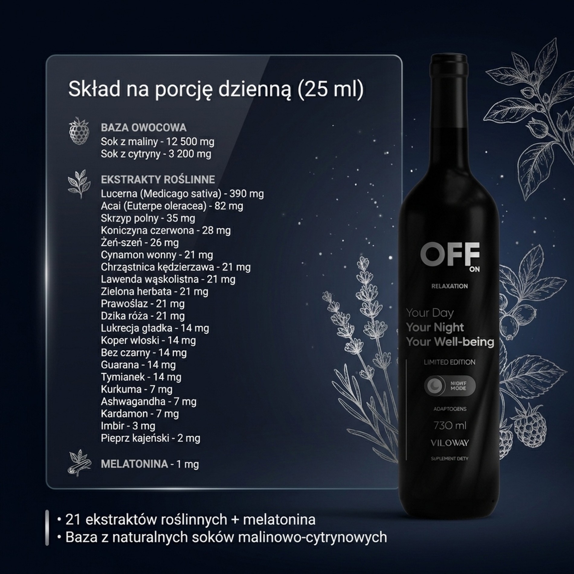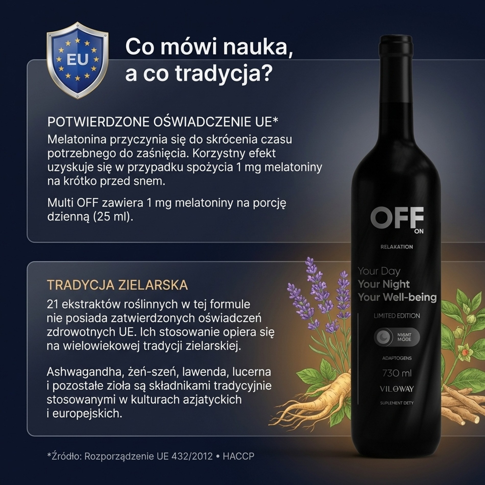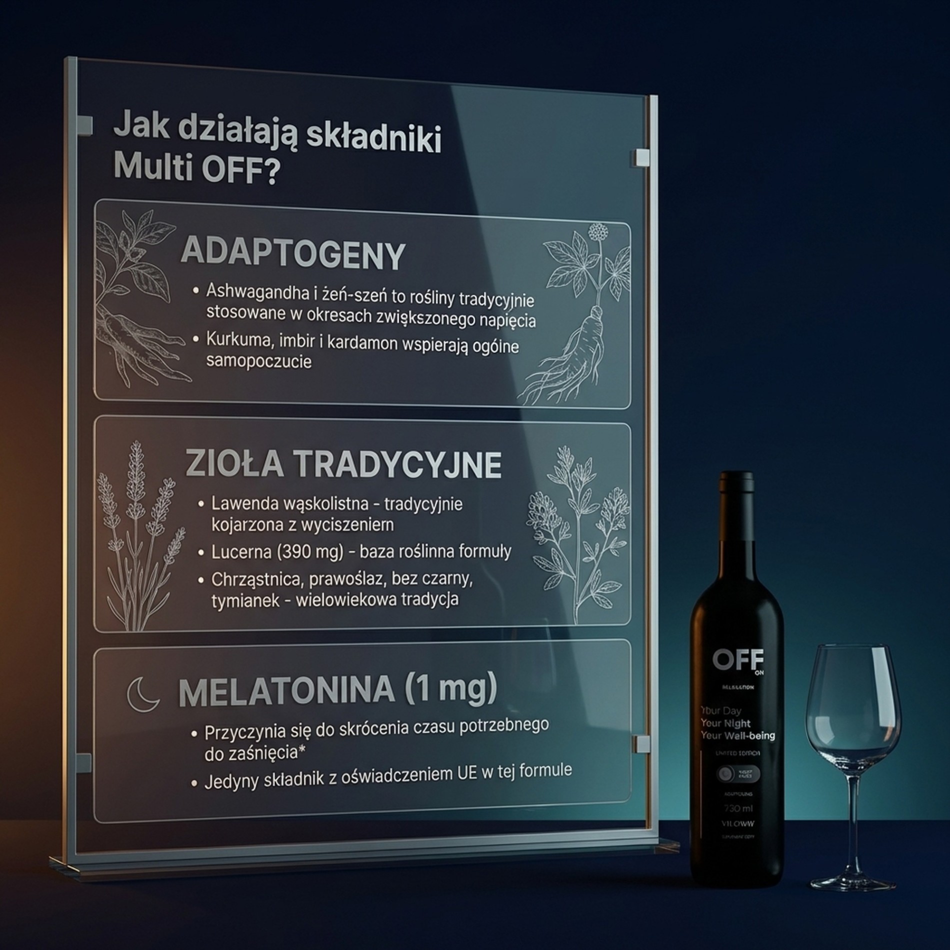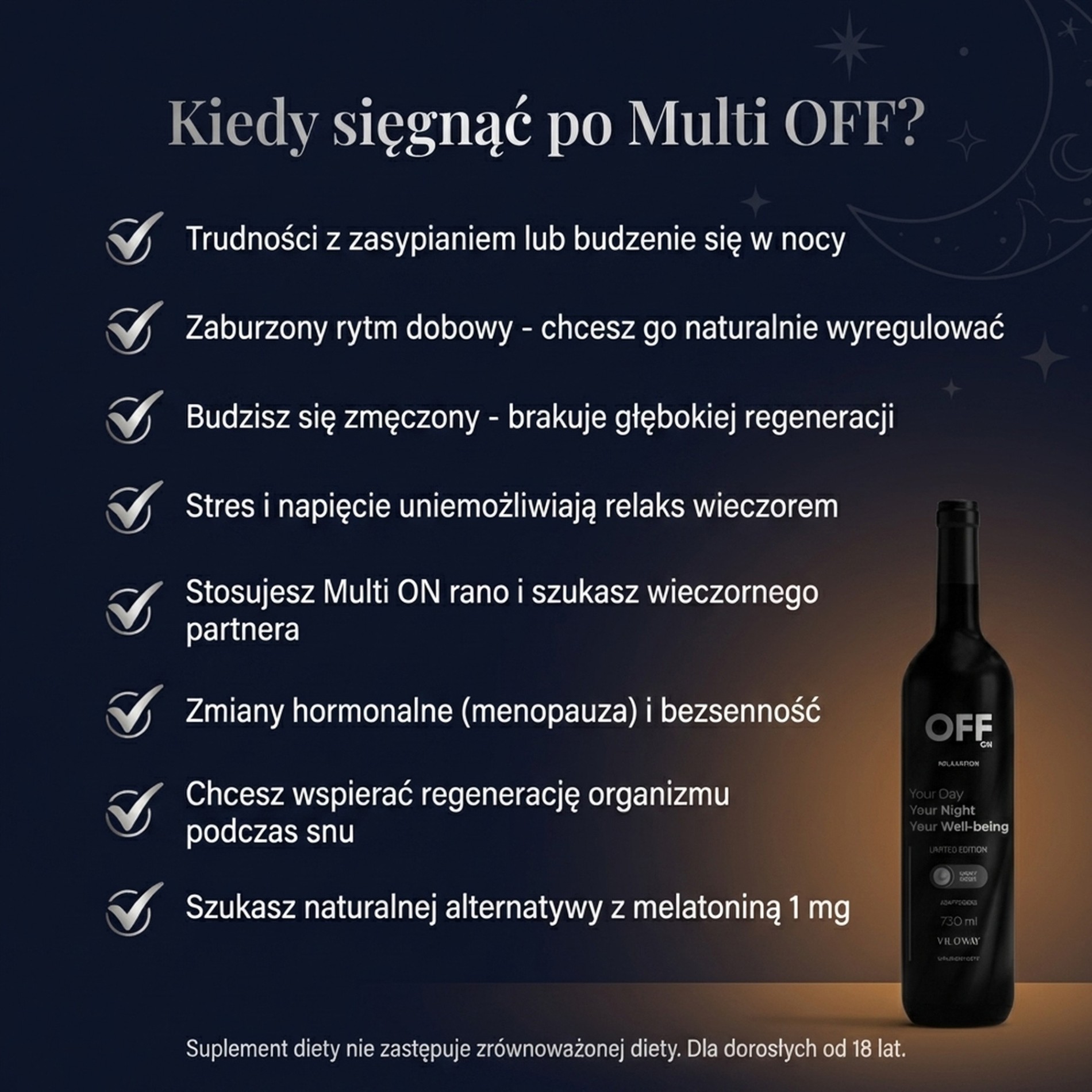 The Multi OFF formula was created based on natural ingredients that support healthy sleep and the body’s regeneration. The included plant extracts, such as ginseng, lavender, and alfalfa, promote relaxation, reduce stress, and improve sleep quality. Multi OFF also contributes to improving skin condition, so you can enjoy a healthy appearance every day
