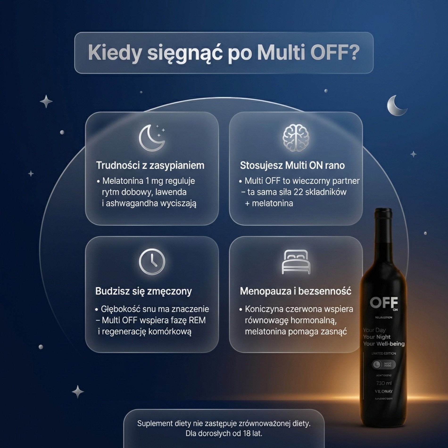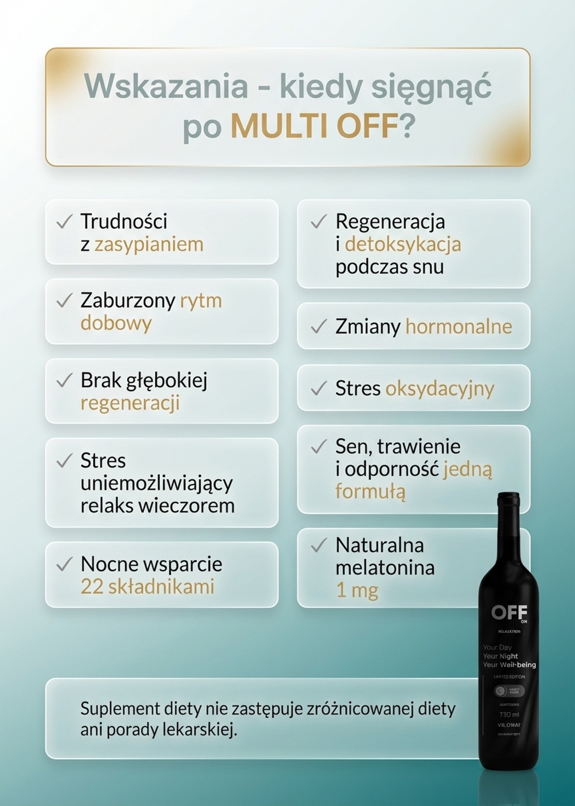 Kiedyś potrafiłam wiercić się w łóżku godzinami. Teraz? Wypijam Multi-Off i zasypiam w kilka minut. Cała noc bez przebudzeń, a rano wstaję z uśmiechem. Czuć, że sen naprawdę regeneruje.