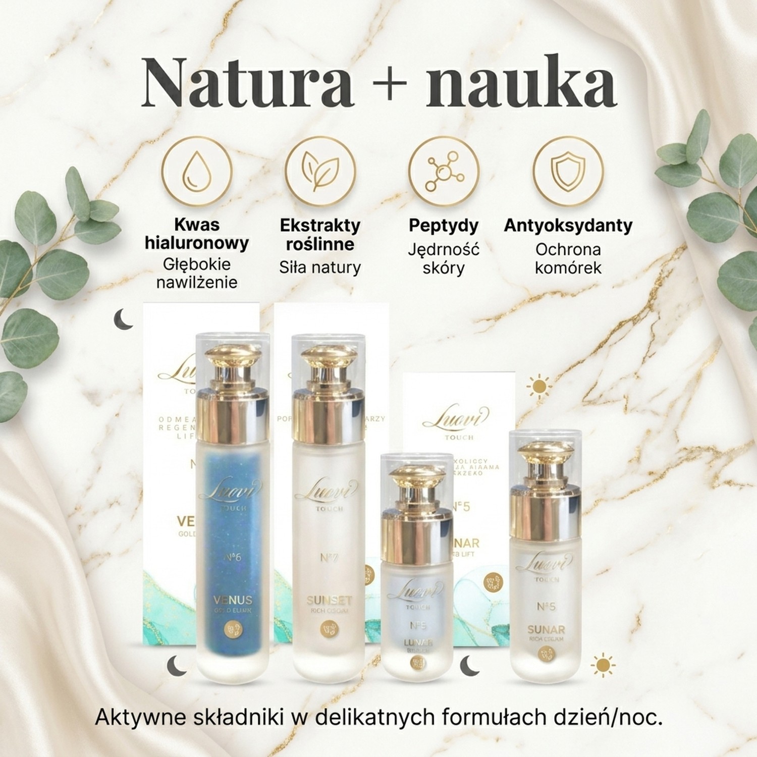 Jako chemik i kosmetolog projektowałam Pakiet LUOVI Touch Komplet jako najbardziej zaawansowany system pielęgnacji anti-aging dostępny w domowej pielęgnacji. Siedem produktów tworzy kompletny cykl od oczyszczania po intensywną regenerację, gdzie każdy krok został precyzyjnie zaprojektowany w oparciu o badania składników aktywnych. Komórki macierzyste z gorzkiej pomarańczy, spirulina, peptydy sygnałowe i kolagen natywny występują w synergicznych kombinacjach, tworząc formułę o skuteczności porównywalnej z profesjonalnymi zabiegami medycyny estetycznej.