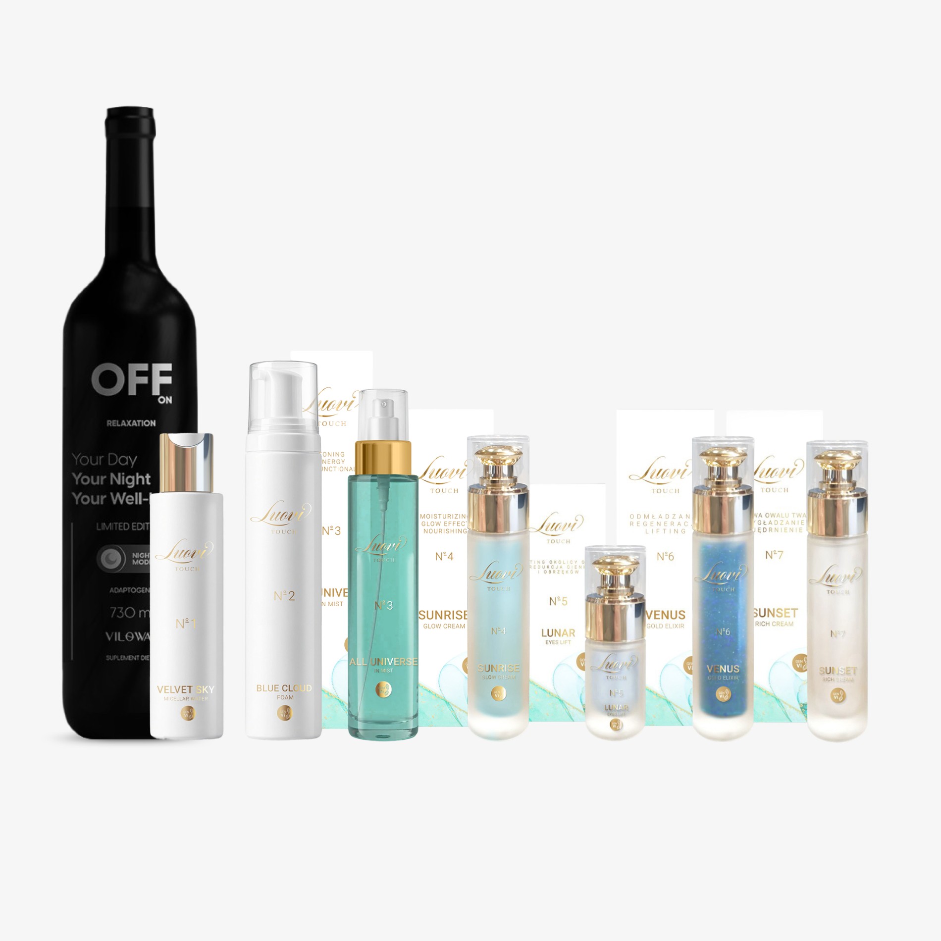 Dodanie Multi OFF z melatoniną i 21 ekstraktami roślinnymi czyni ten pakiet jedynym holistycznym systemem łączącym zewnętrzną pielęgnację suplementacyjną z wewnętrznym wsparciem regeneracji. Melatonina reguluje naturalny rytm odnowy komórkowej, podczas gdy adapotgeny jak ashwagandha i kurkuma wzmacniają systemowe procesy antyoksydacyjne. To połączenie umożliwia maksymalne wykorzystanie potencjału regeneracyjnego skóry zarówno w dzień, jak i w nocy, oferując kompleksowe odmłodzenie na poziomie komórkowym.