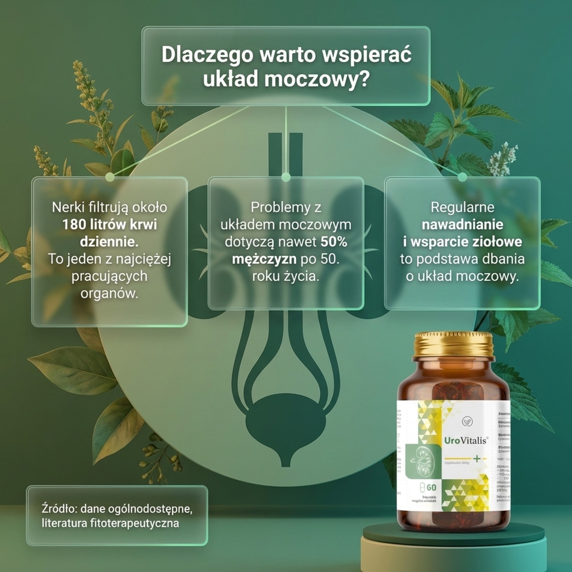 Pokrzywa zwyczajna (Urtica dioica) zawiera naturalne związki krzemowe, flawonoidy i sole mineralne, które od wieków są wykorzystywane w europejskim ziołolecznictwie do wsparcia funkcji układu moczowego. Ekstrakt DER 10:1 zapewnia wysokie stężenie składników aktywnych.