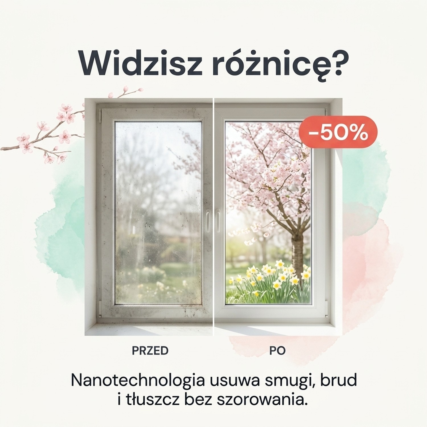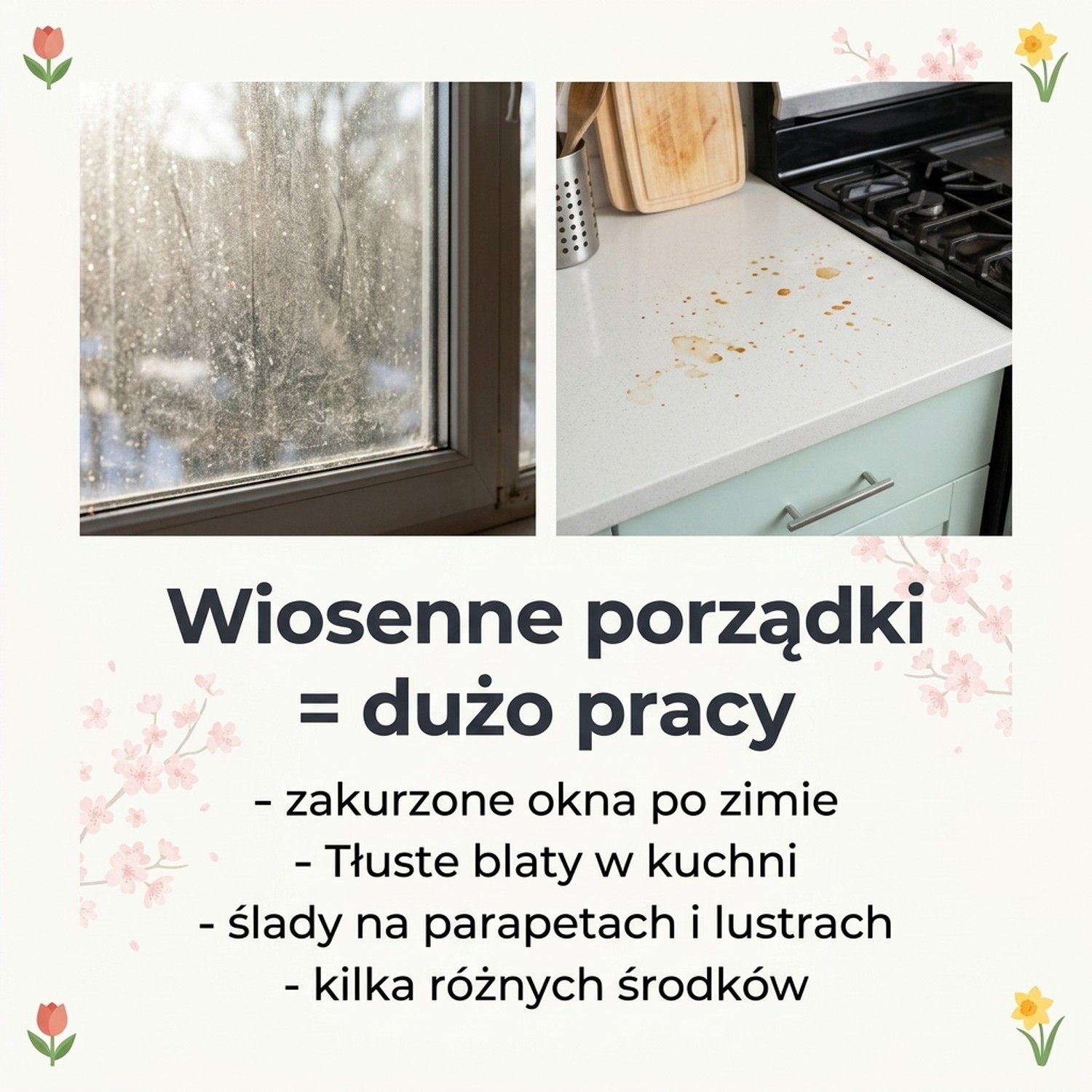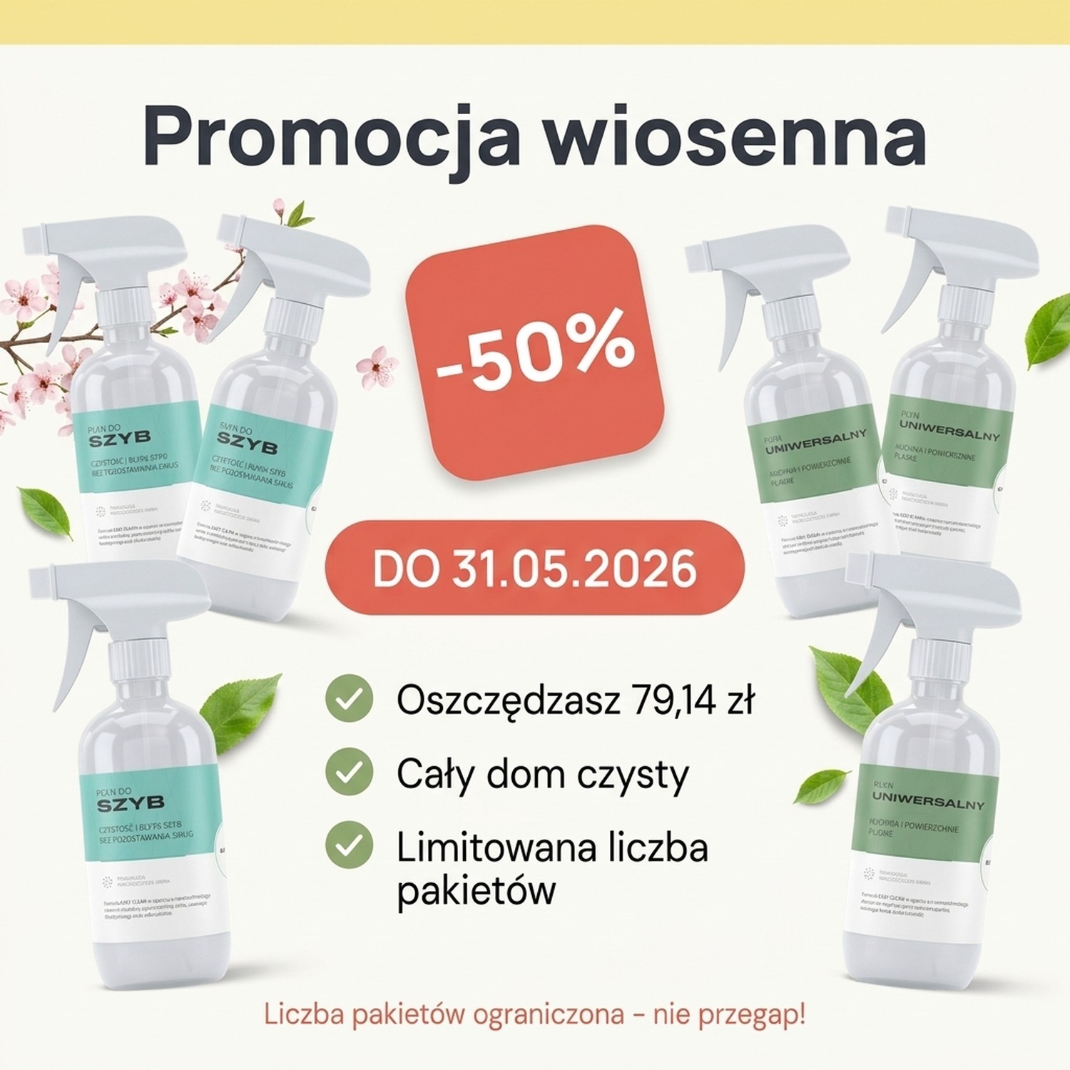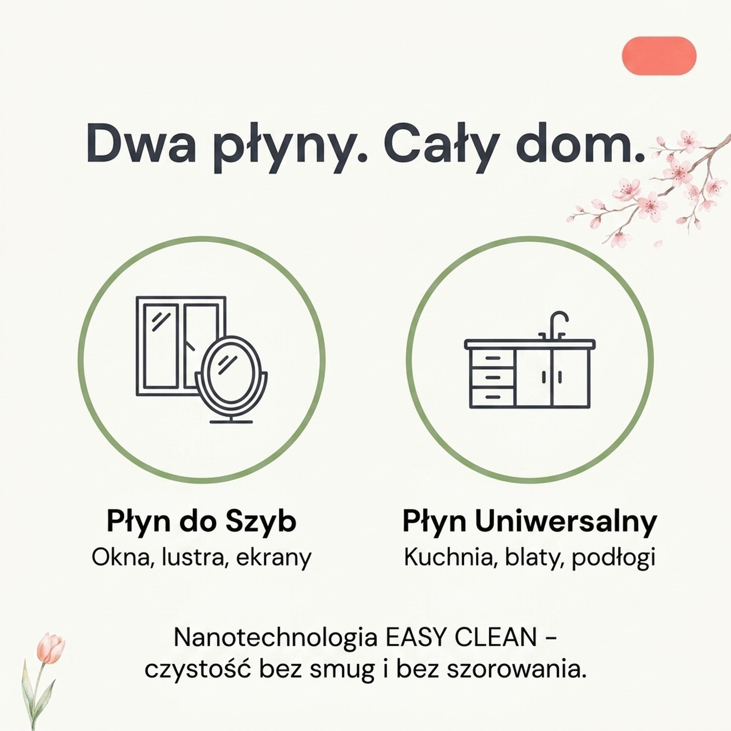Wiosna to czas otwartych okien, świeżego powietrza i wielkich porządków. Pakiet EASY CLEAN Wiosenne Porządki to kompletny zestaw do umycia całego domu - okien zakurzonych po zimie, blatów w kuchni, luster, parapetów, podłóg i ekranów. Dwa nanotechnologiczne płyny, które razem pokrywają każdą powierzchnię w domu.
