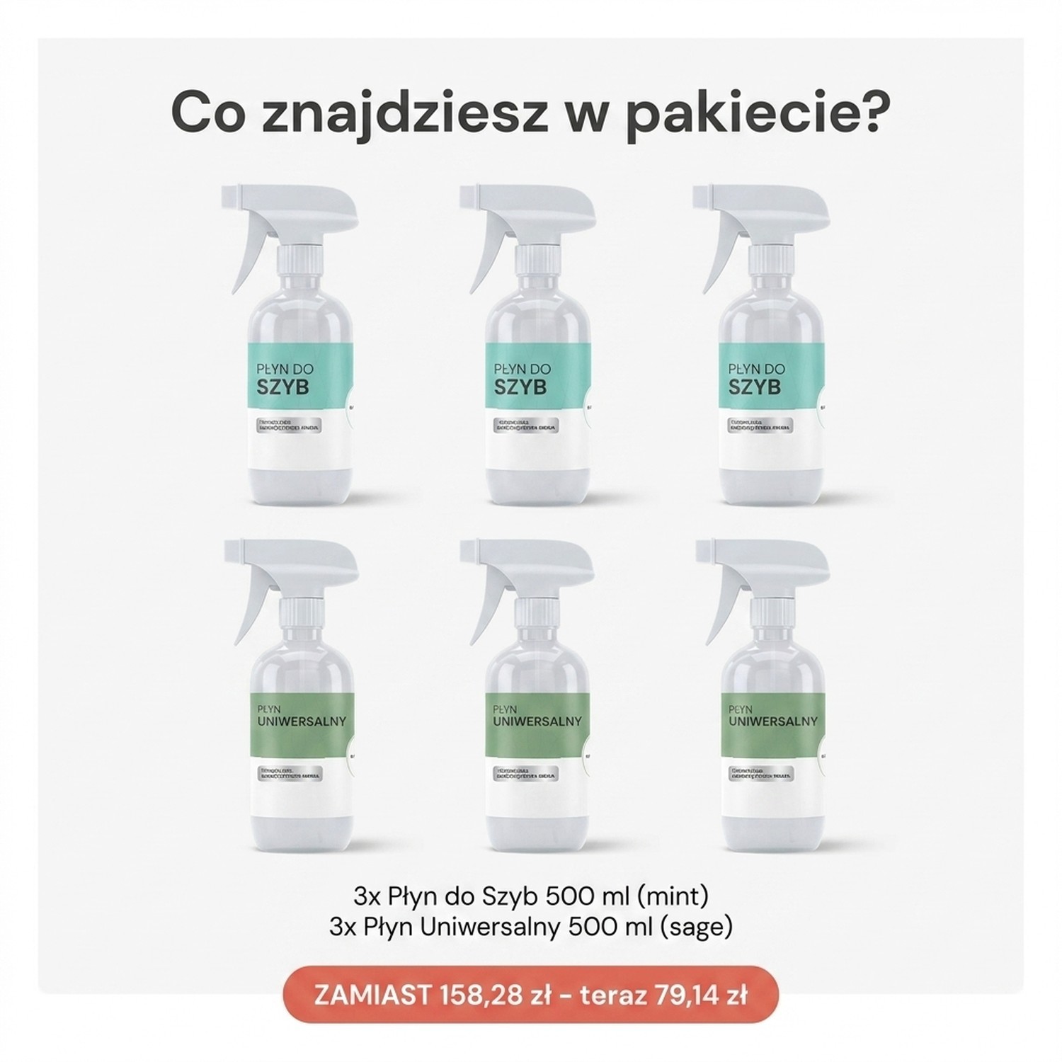 W pakiecie otrzymujesz 3 butelki Płynu do Szyb (mint 500 ml) do okien, luster i ekranów oraz 3 butelki Płynu Uniwersalnego (sage 500 ml) do blatów, kuchni, podłóg i stołów. Łącznie 3 litry nanotechnologicznej czystości - wystarczy na wiosnę, lato i początek jesieni.