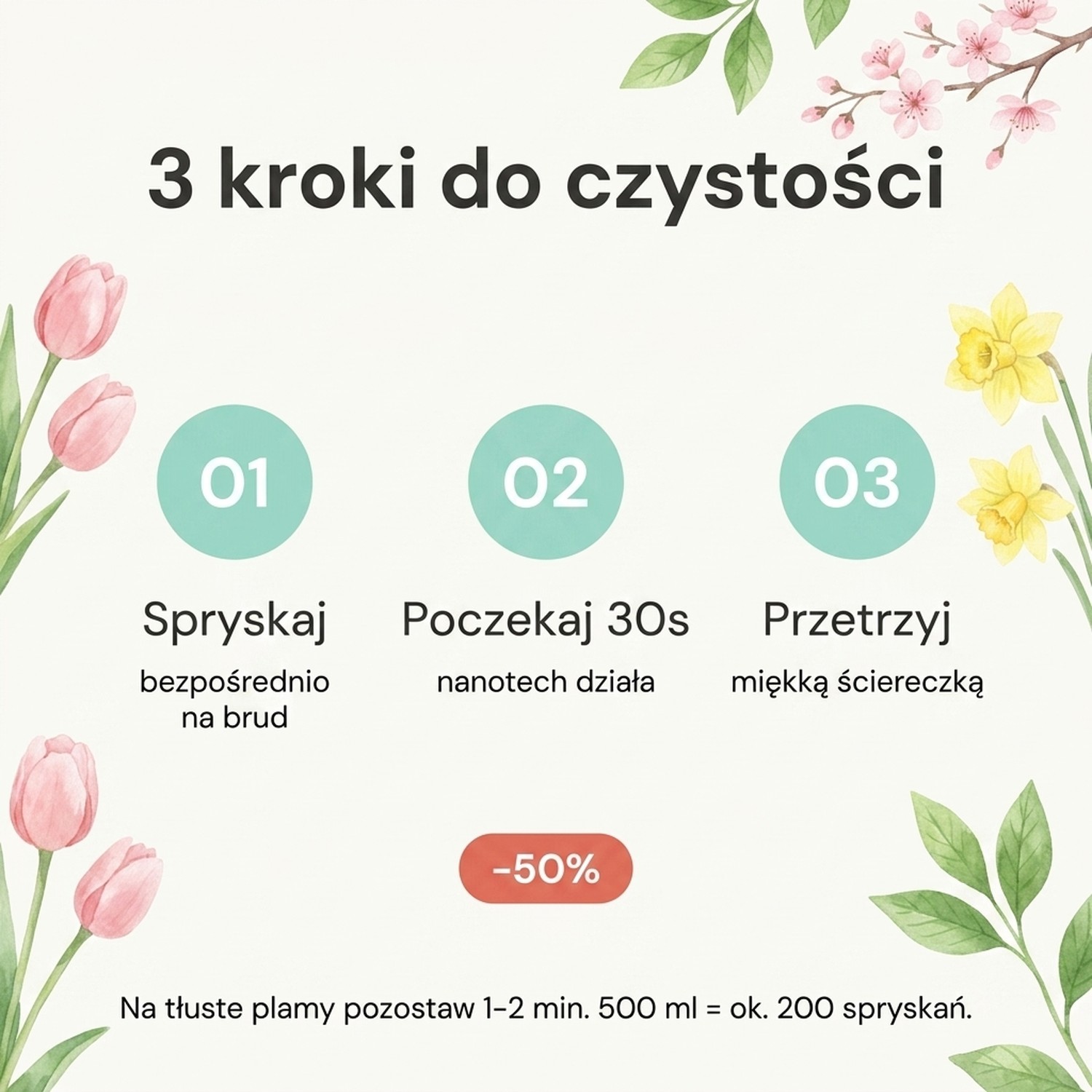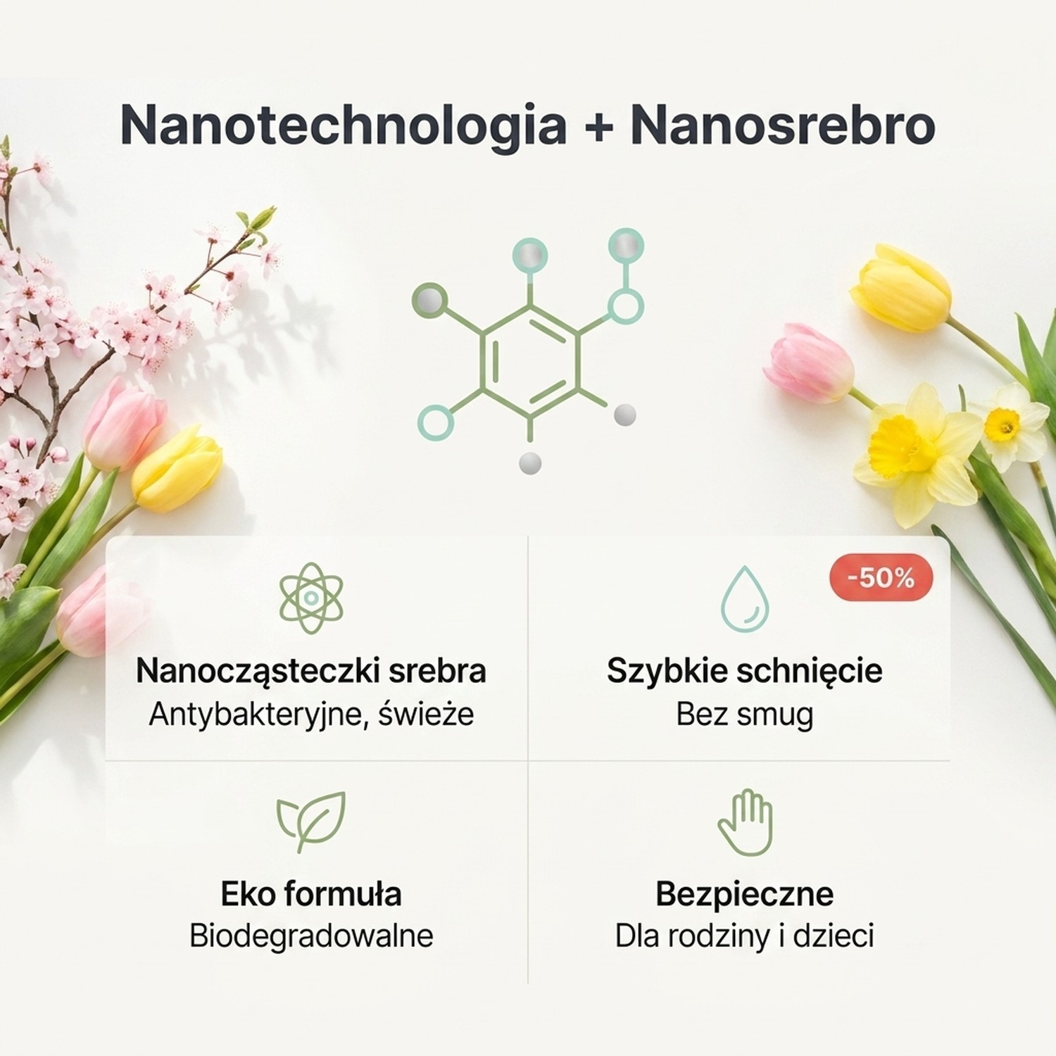 Formuła z nanocząsteczkami srebra działa antybakteryjnie, szybko się rozprowadza i nie pozostawia smug. Biodegradowalna, bezpieczna dla rodziny i zwierząt, przyjazna dla środowiska. Jeden pakiet - cały dom gotowy na wiosnę.