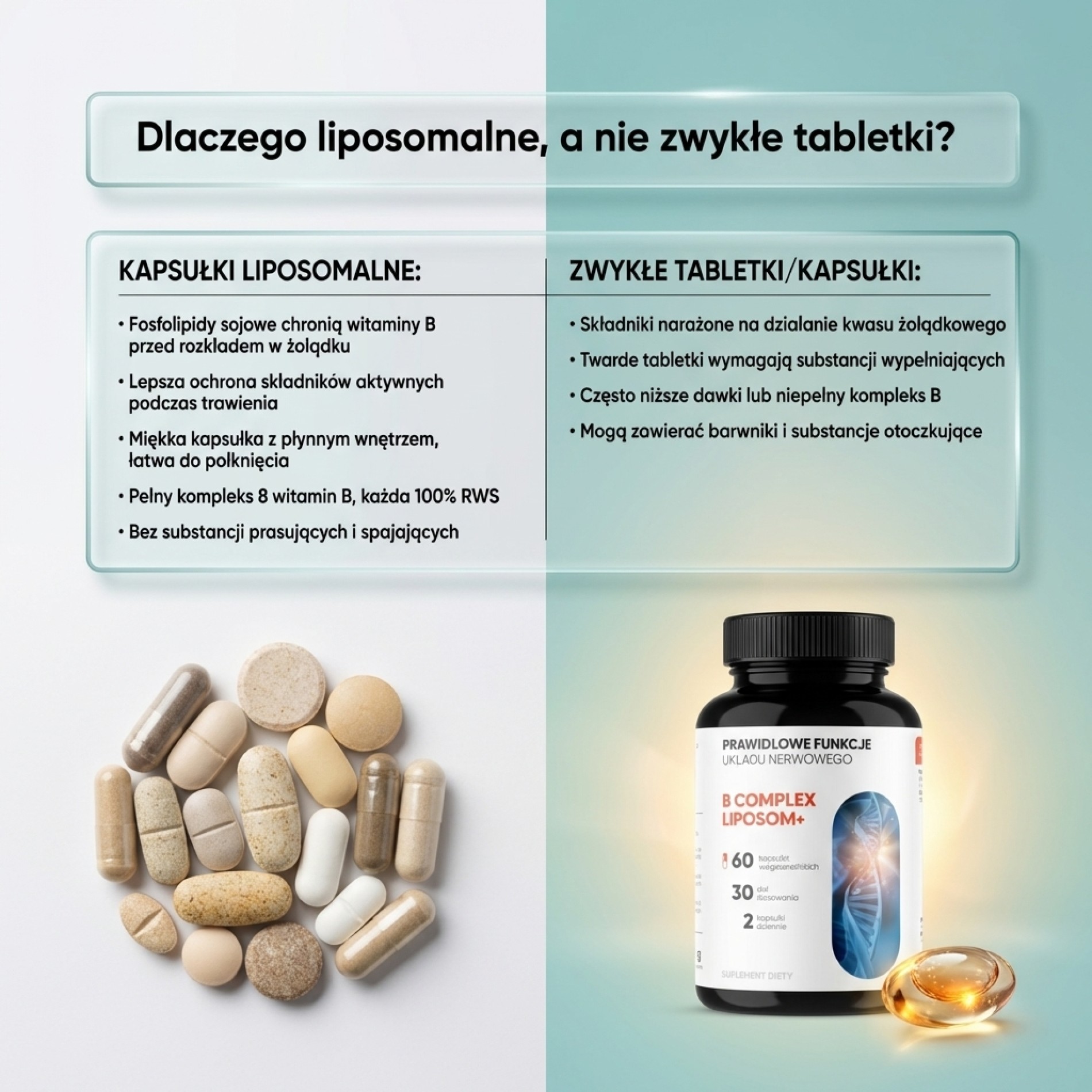 Kluczowym problemem tradycyjnej suplementacji witamin B jest ich niska biodostępność i szybka eliminacja z organizmu. Technologia liposomalna wykorzystująca fosfolipidy sojowe rozwiązuje ten problem poprzez enkapsulację składników aktywnych w naturalne otoczki lipidowe, które chronią witaminy przed degradacją w przewodzie pokarmowym i umożliwiają ich efektywny transport do komórek docelowych.