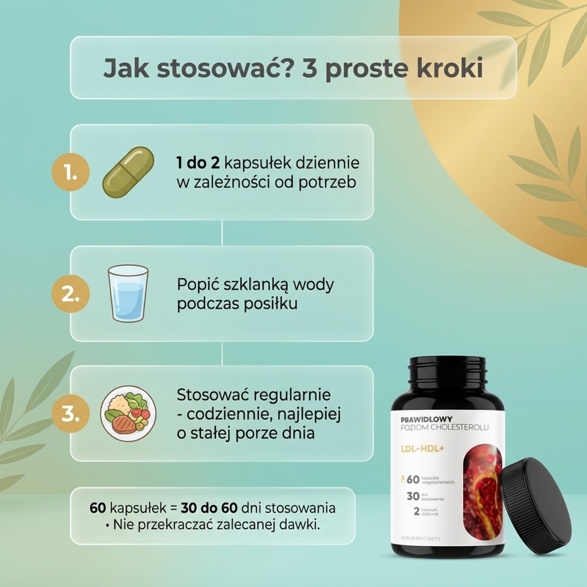 2 kapsułki dziennie podczas posiłku. Minimum 60-90 dni regularnego stosowania + monitorowanie poziomu cholesterolu. Łączyć ze zbilansowaną dietą i aktywnością fizyczną.