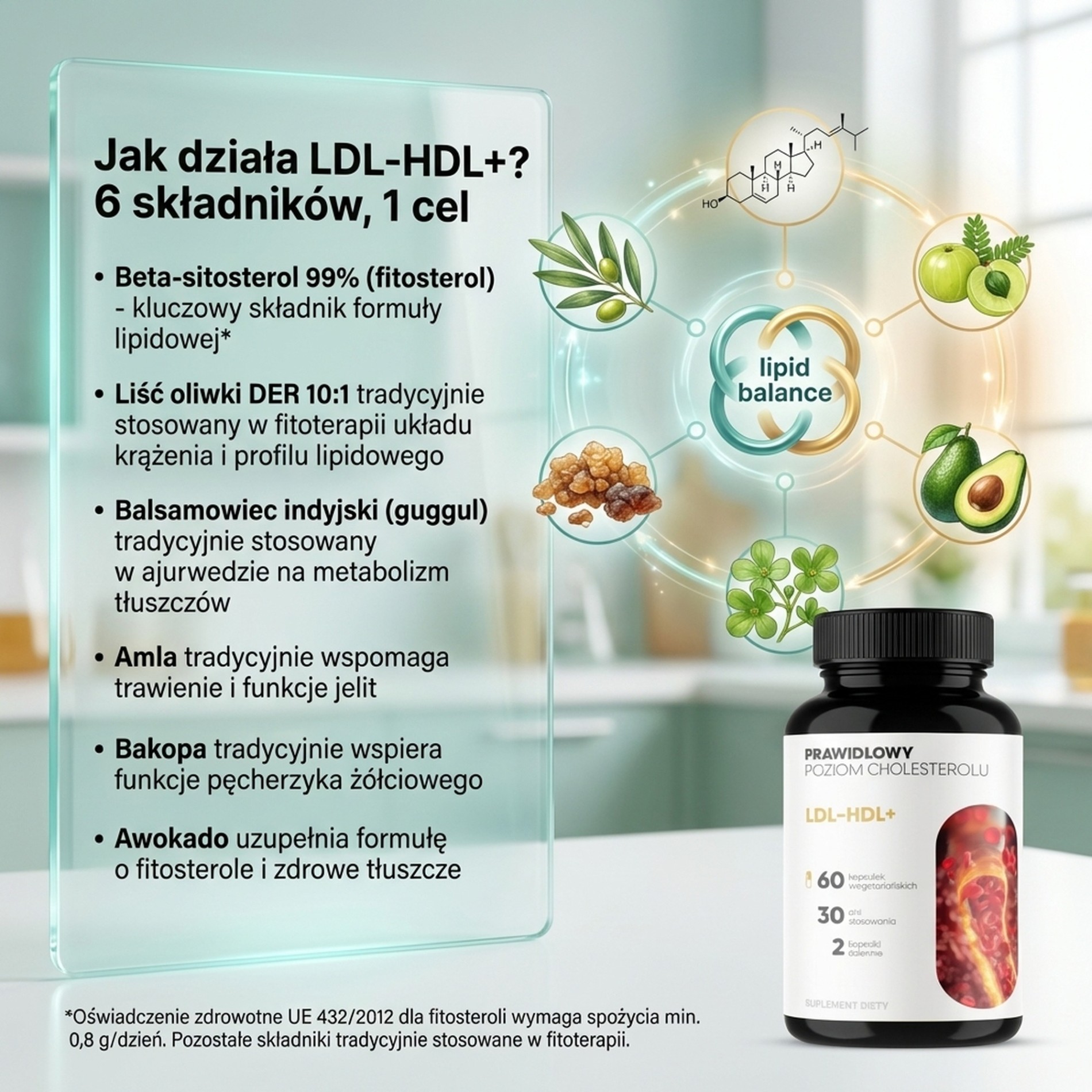 Zdrowa dieta i suplementacja ziołowa wspomaga walkę ze złym cholesterolem. Balsamowiec pomaga utrzymać zdrowy i prawidłowy poziom cholesterolu oraz tłuszczów w organizmie człowieka. Pomaga utrzymać prawidłowy poziom glukozy jako element zdrowego stylu życia. Amla wspiera trawienie i prawidłową czynność układu jelitowego. Bakopa pomaga utrzymać prawidłową funkcję pęcherza żółciowego (i dróg żółciowych).