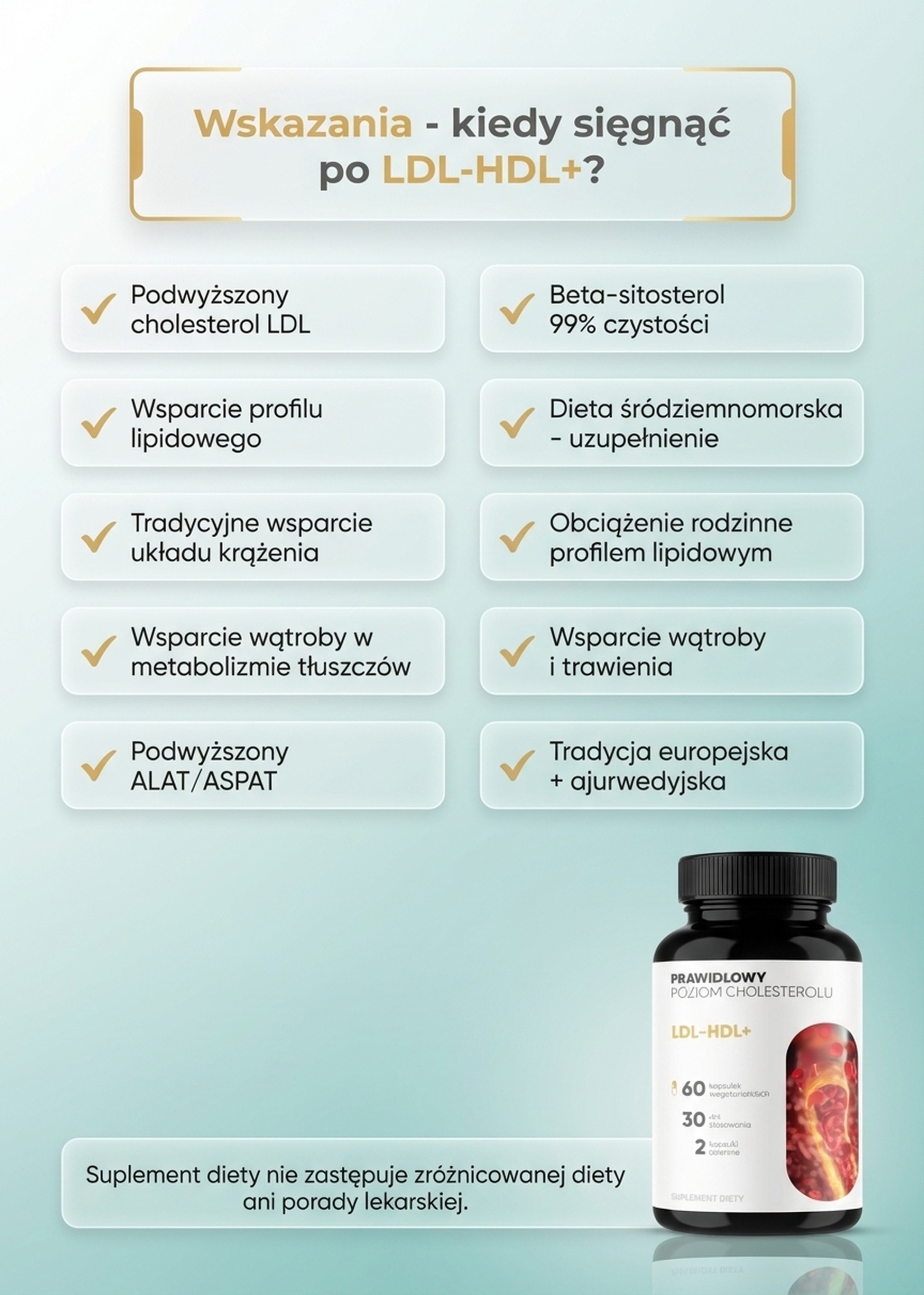 LDL-HDL+ warto włączyć przy podwyższonym cholesterolu LDL, w ramach profilaktyki chorób serca, przy rodzinnej historii miażdżycy lub jako wsparcie obok zmiany diety i aktywności fizycznej.