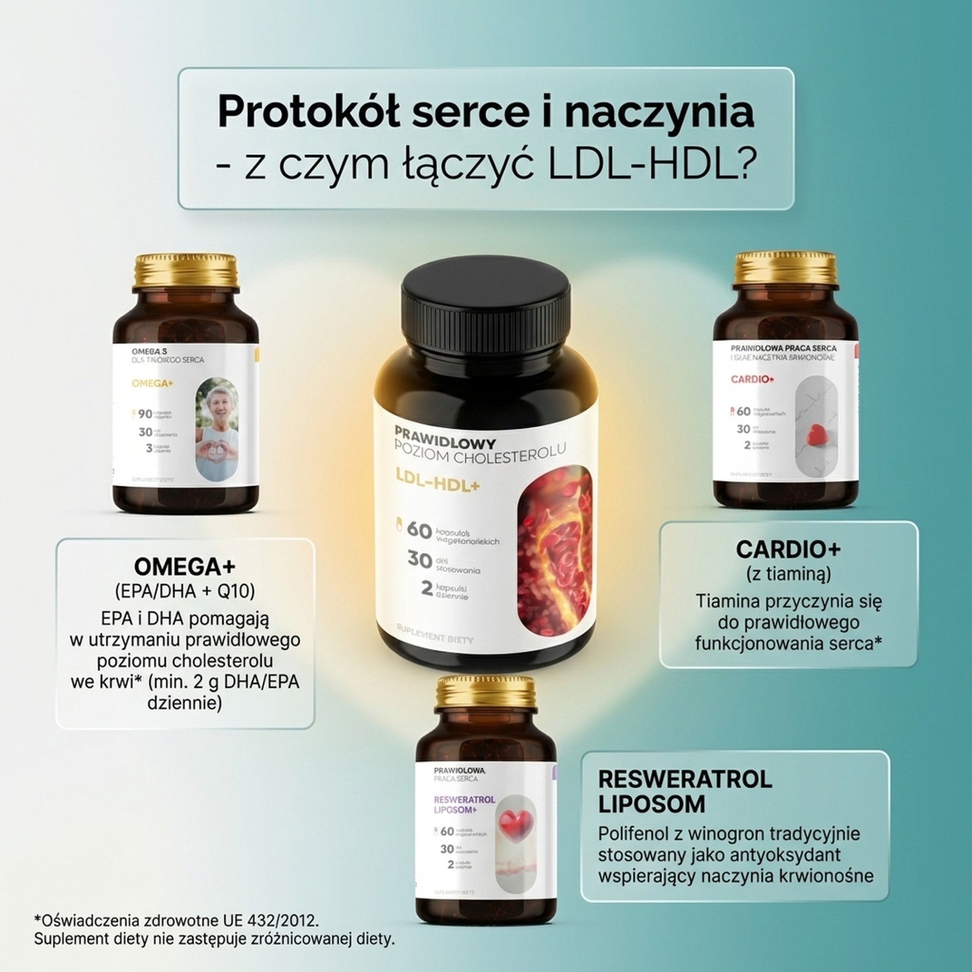 LDL-HDL+ dobrze komponuje się z Omega+ (kwasy EPA DHA), Cardio+ (zdrowie serca) oraz Resweratrol Liposom+ (antyoksydanty). Kompleksowa formuła kardiologiczna.