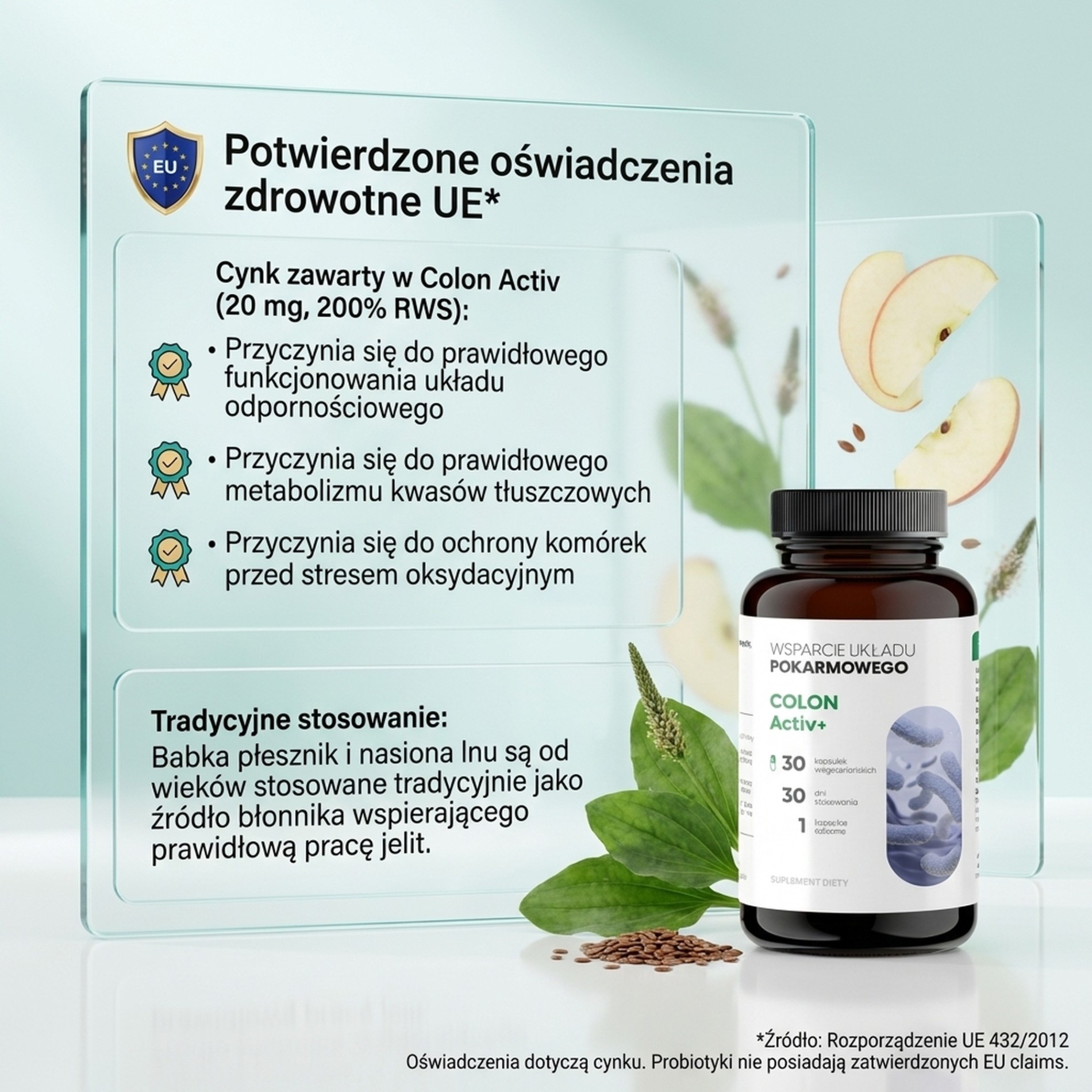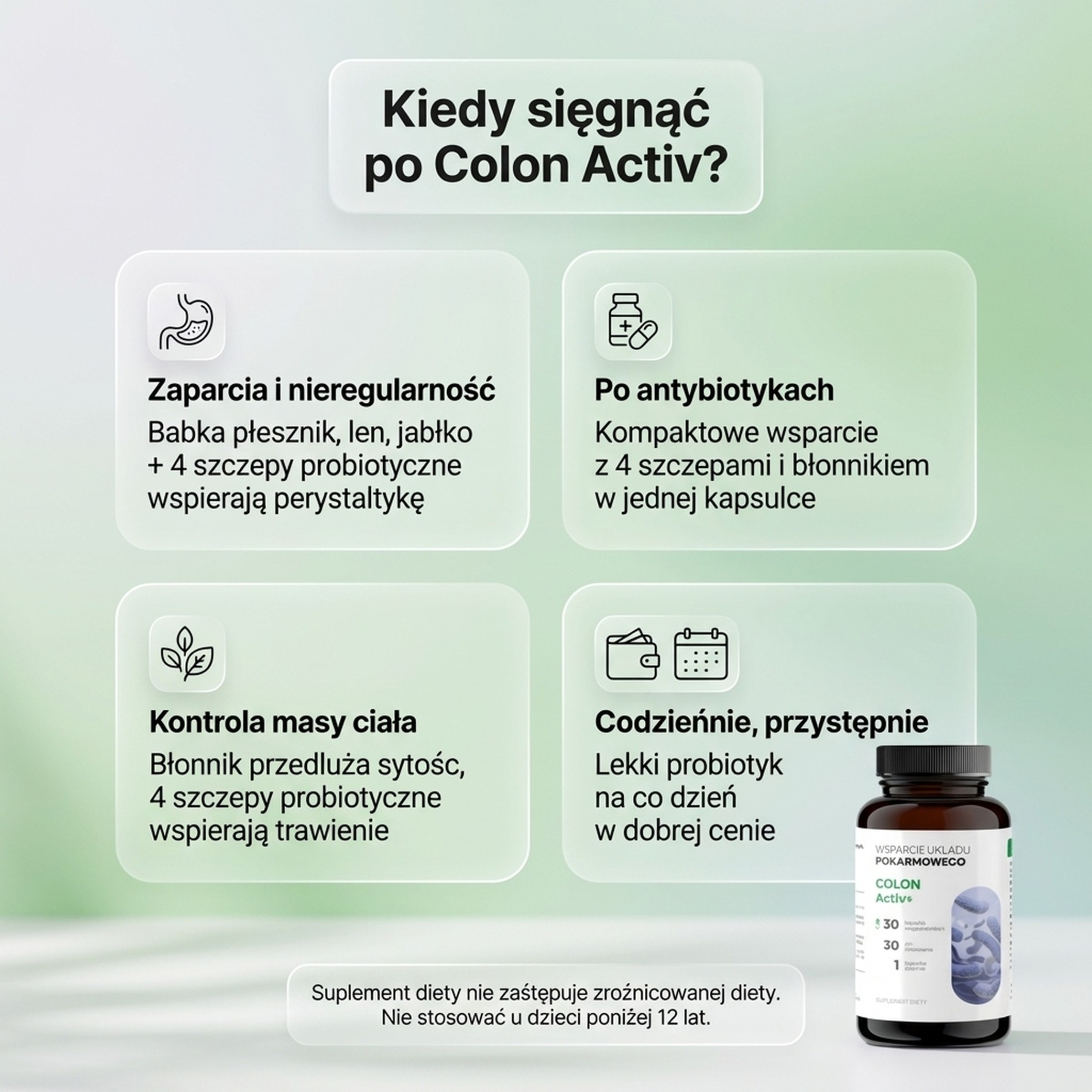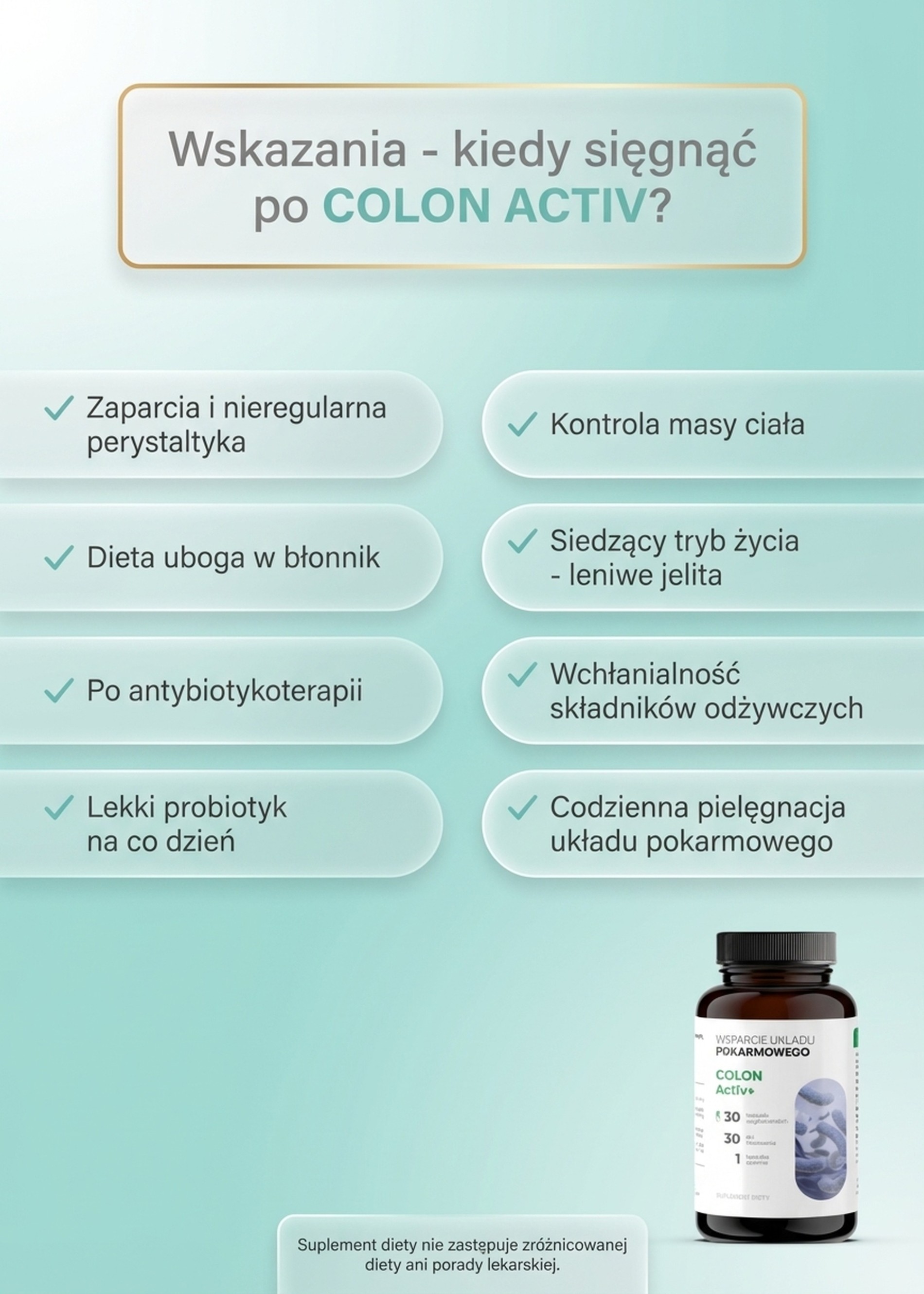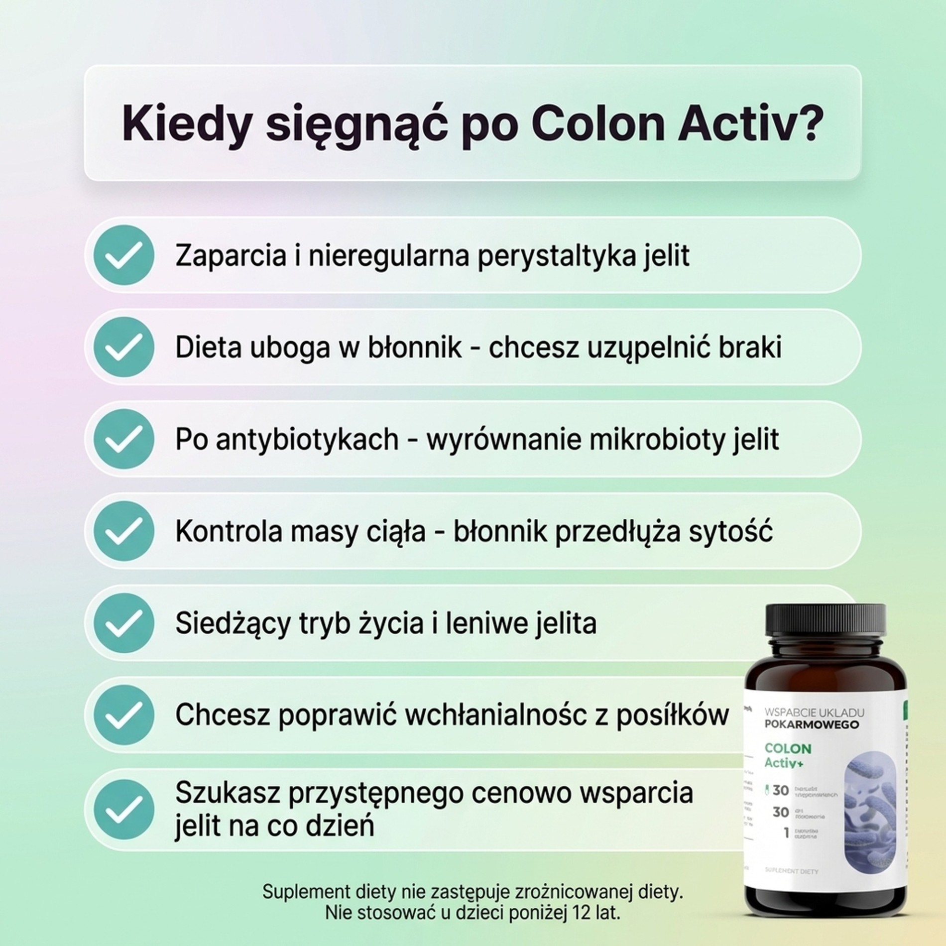 Suplement diety ColonActiv zawierający błonnik pokarmowy (włókno pokarmowe) odgrywa ważną rolę w prawidłowym odżywianiu. Zawiera cztery szczepy bakterii mających korzystny wpływ na układ pokarmowy.