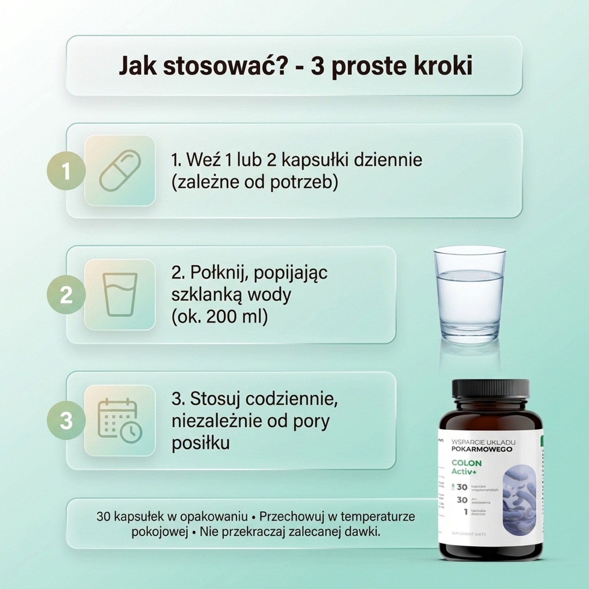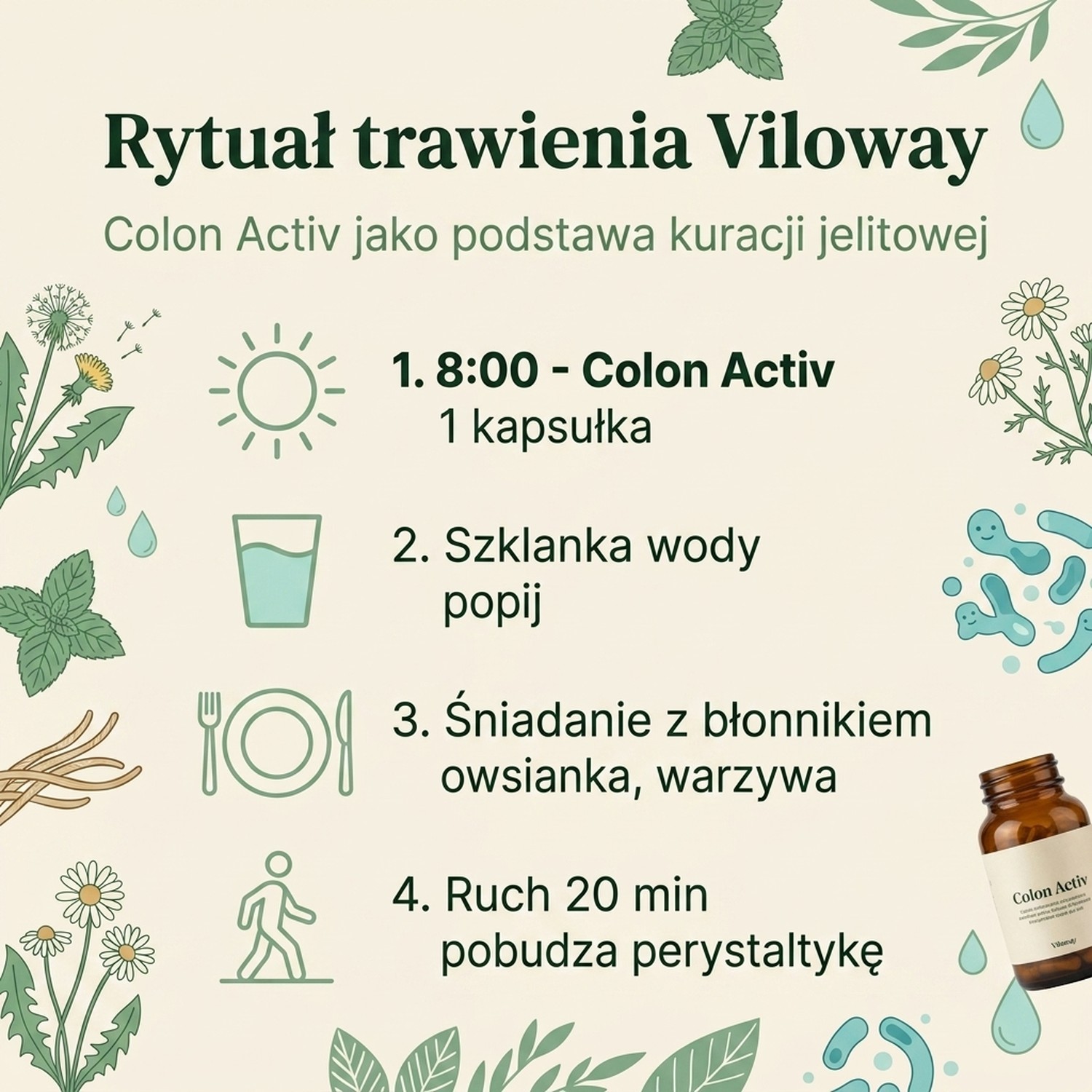 ColonActiv wspomaga perystaltykę jelit i pomaga w trawieniu. Dodatkowo przyczynia się do budowy dobrej ochrony jelit oraz pomaga regulować ich pracę.