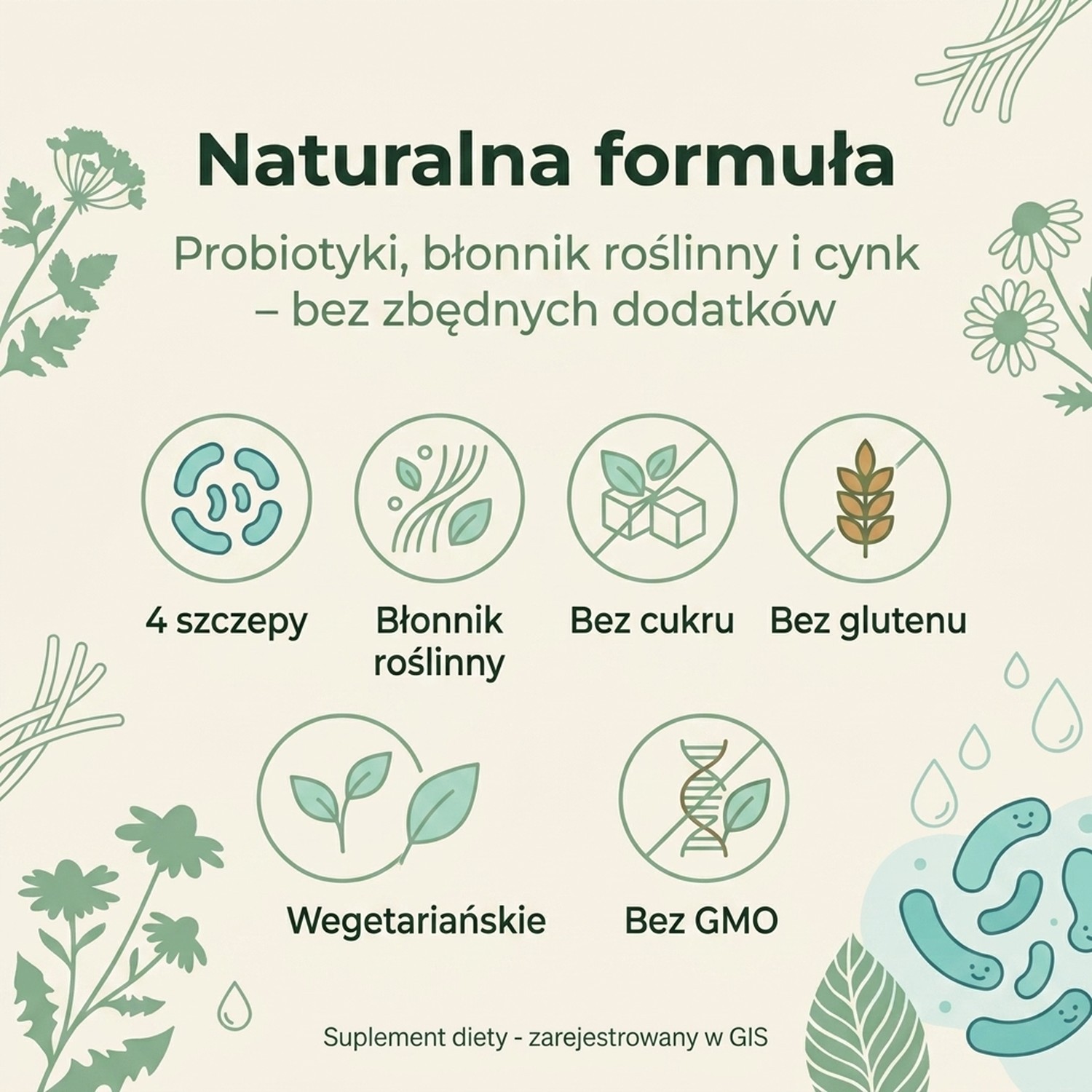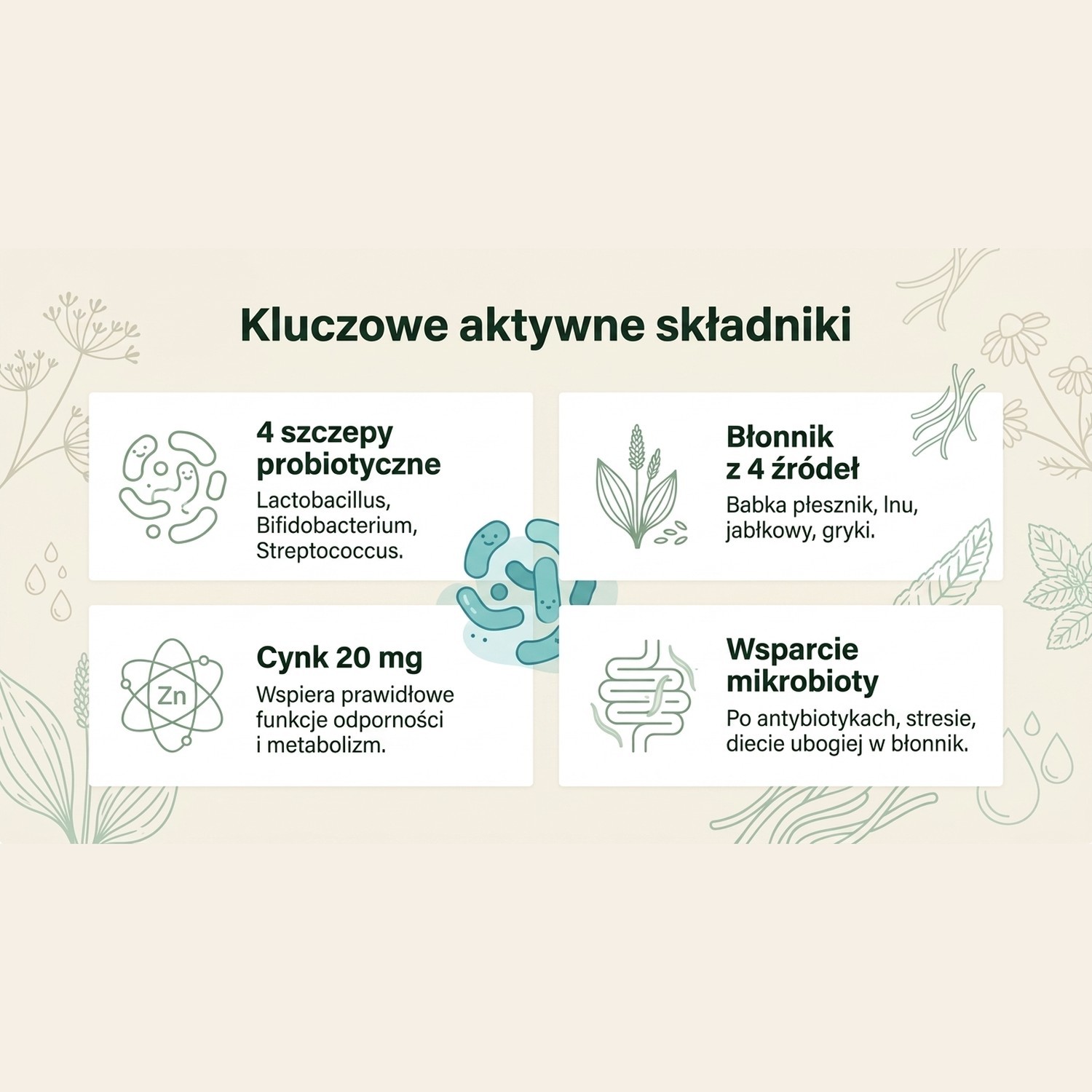 Unikalny błonnik zawierający cztery bezcenne szczepy bakterii (Lactobacillus acidophilus, Lactobacillus casei subsp Rhamnosus, Bifidobacterium bifidum, Streptococcus thermophilus).