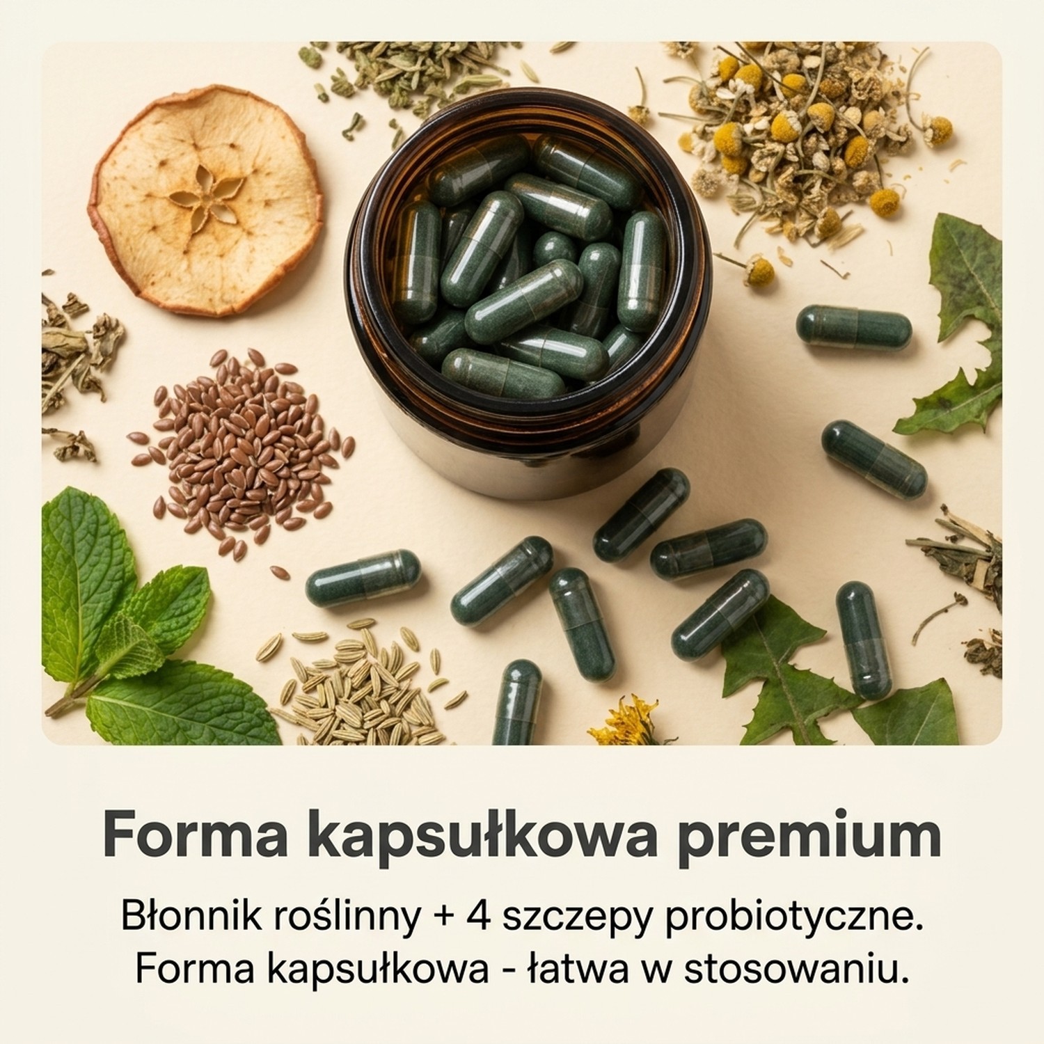 Wzbogacony o naturalny błonnik pozyskany z Babki płesznik, odtłuszczonych nasion złotego lnu, jabłek oraz gryki.