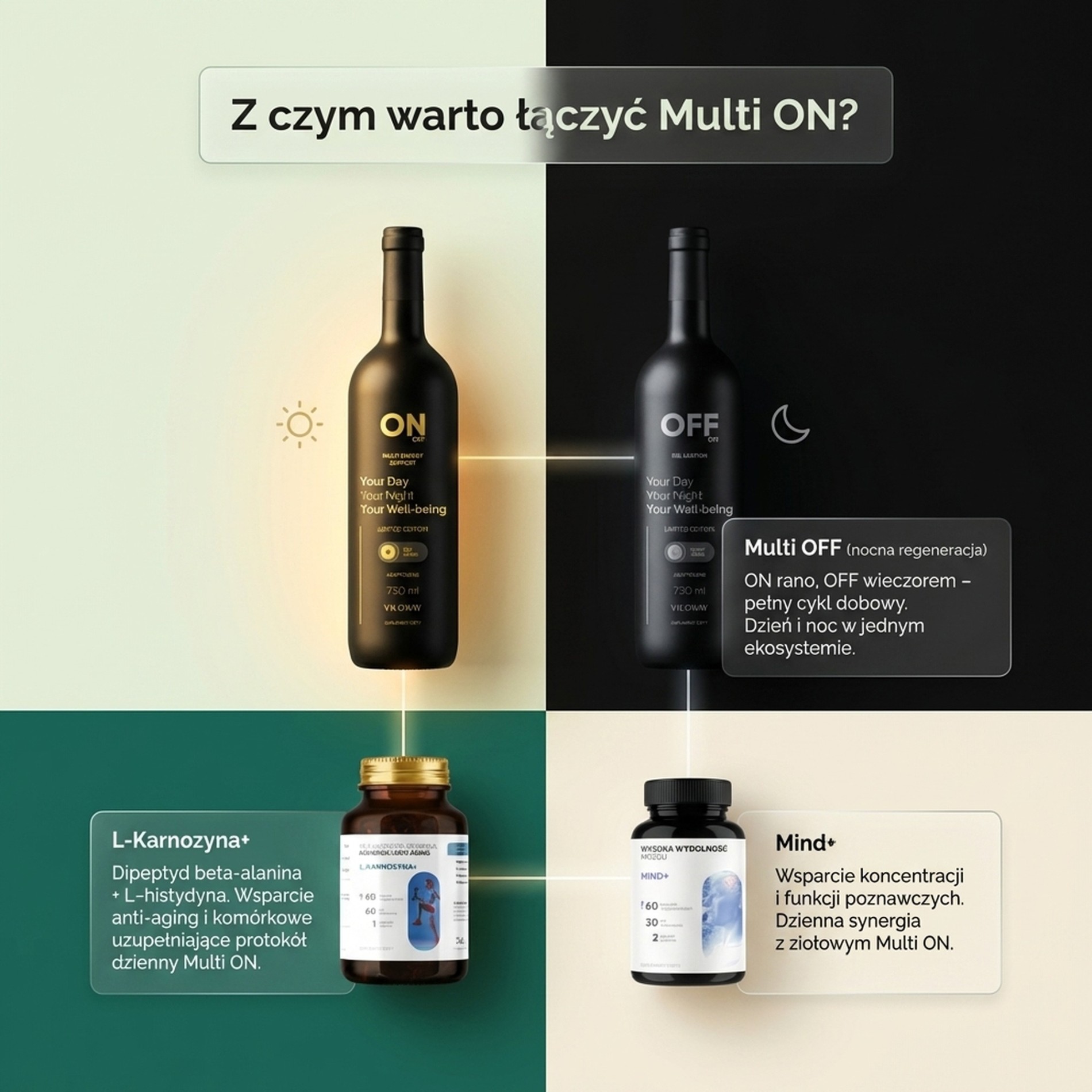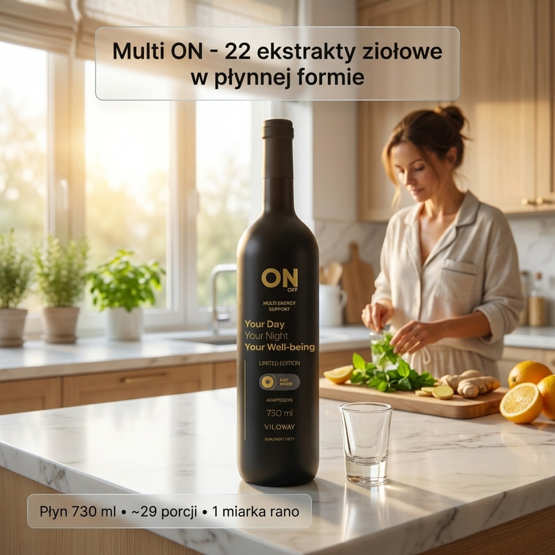 Multi ON jest specjalnie zaprojektowany, aby wspierać energię i witalność w ciągu dnia, dzięki czemu jest świetnym wyborem na początek suplementacji. Jego składniki, takie jak guarana i zielona herbata, mogą zapewnić natychmiastowe pobudzenie, a inne składniki, jak ashwagandha i żeń-szeń, wspierają ogólną odporność i redukują stres.