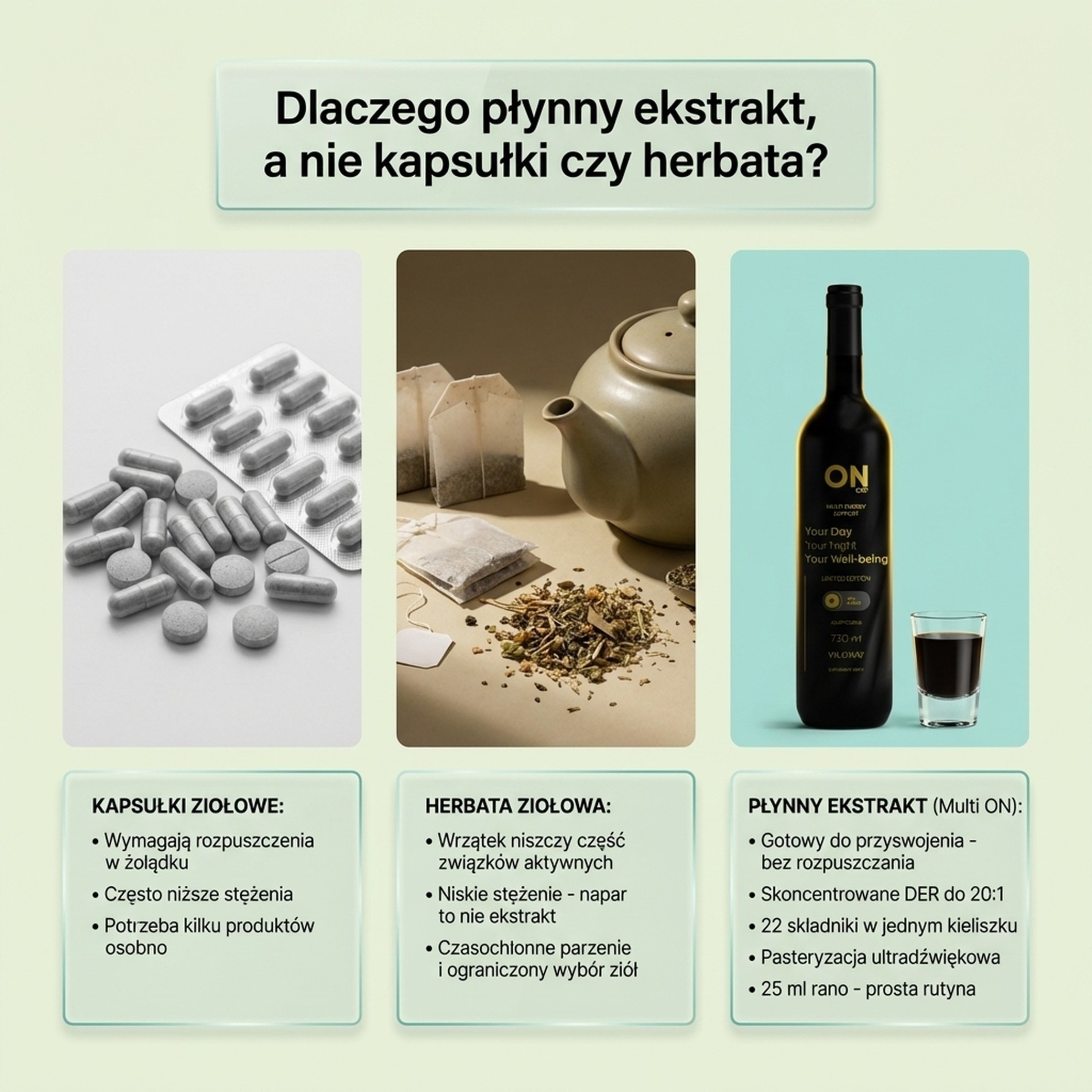 Ekstrakty są skoncentrowaną formą ziół, które zawierają wyższe stężenie aktywnych składników niż surowe zioła. Proces ekstrakcji pozwala na oddzielenie tych cennych substancji od reszty rośliny, co ułatwia ich przyswajanie przez organizm i może zwiększać efektywność suplementu, takiego jak Multi ON. Ekstrakty ziołowe oferują bardziej potężne i skierowane działanie niż całe zioła.