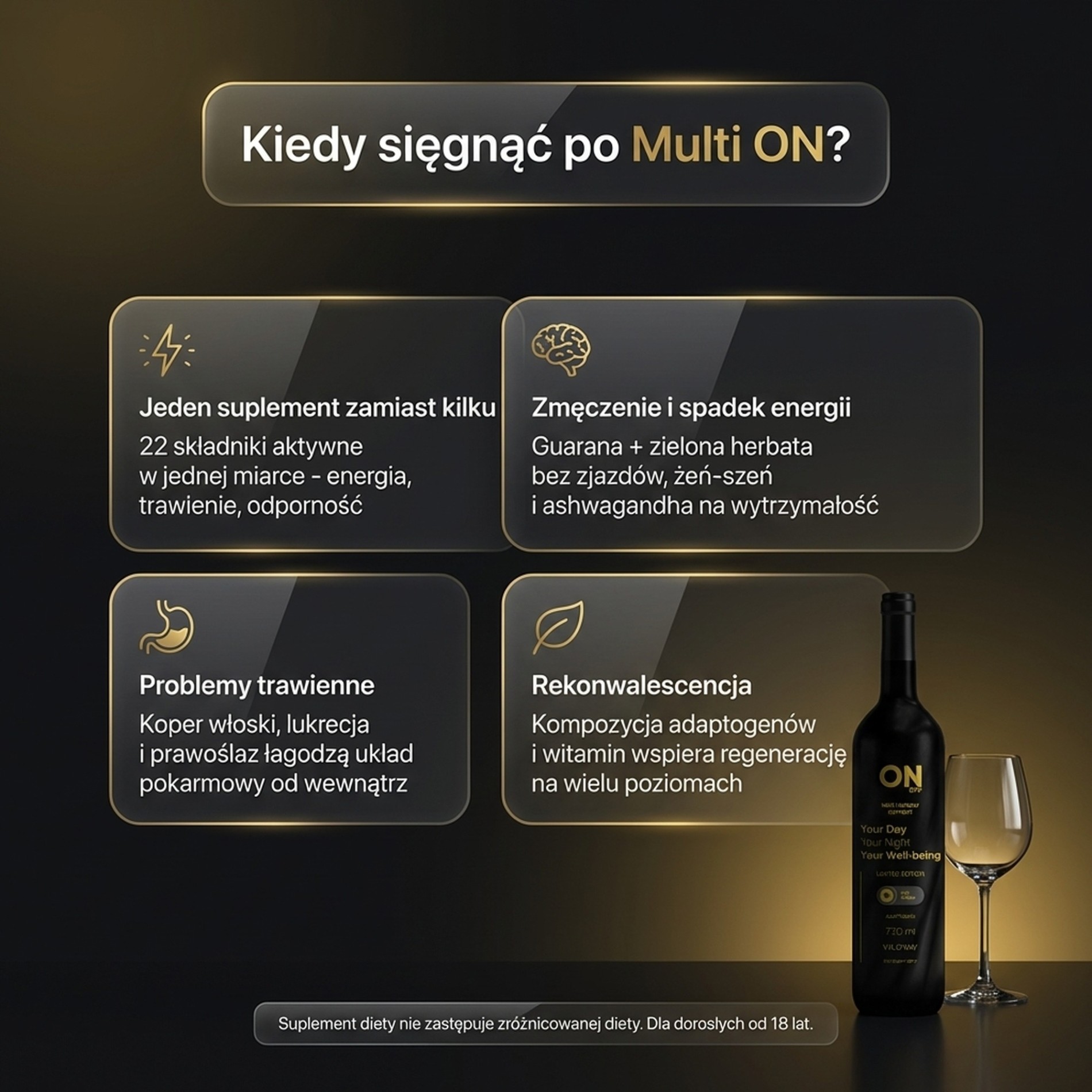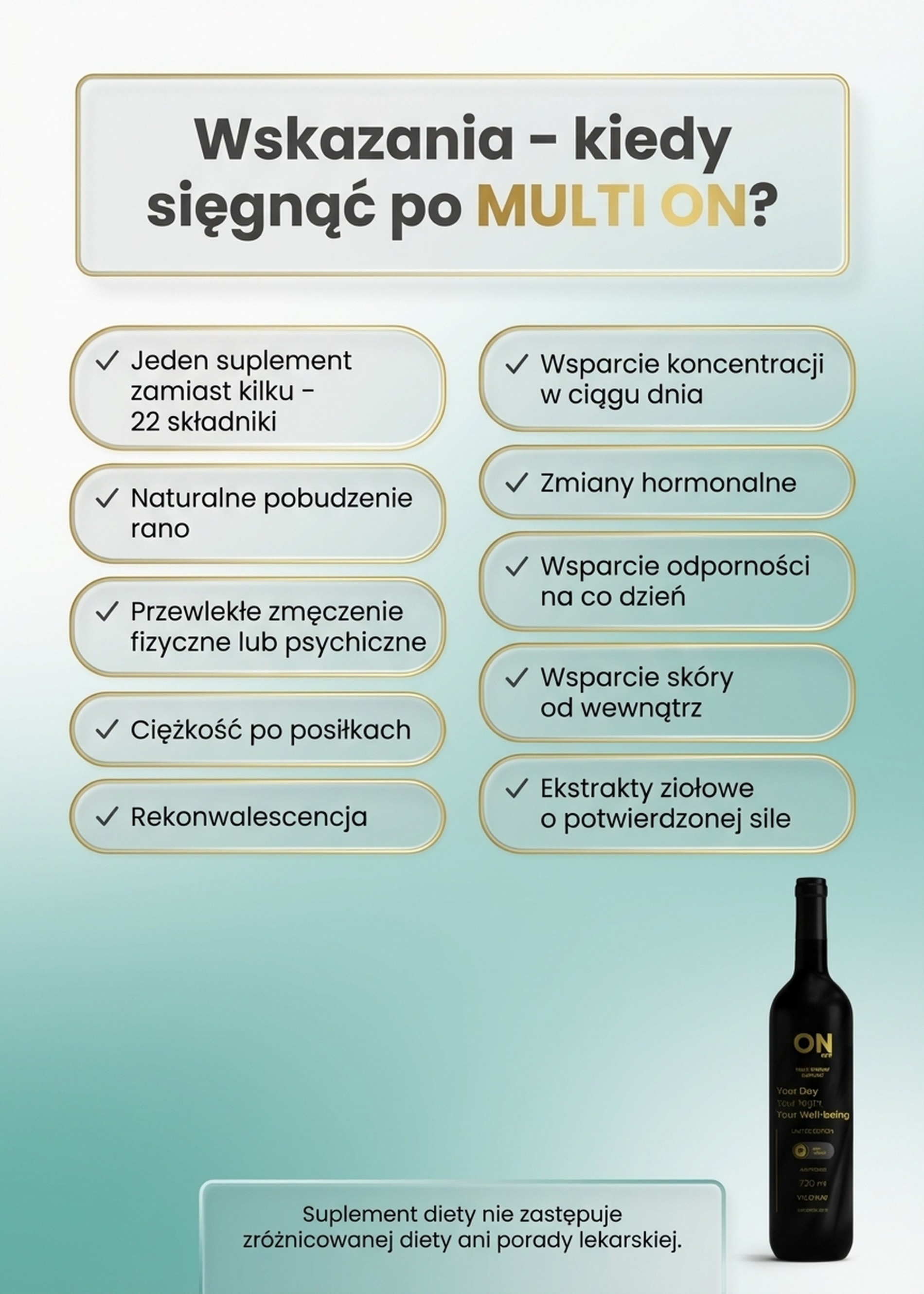 - chcesz otrzymać maksymalne wsparcie, korzystając z minimalnej ilości suplementów - Multi ON to 22 składniki aktywne.